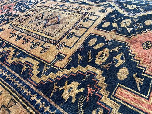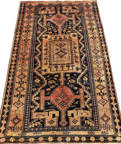 A 1960's TRIBAL LURI, 100% HAND-SPUN WOOLEN RUG WITH ALL NATURAL VEGETABLE DYES. TRIBAL DESIGN OF RECTANGULAR ANCHORED MEDALLION WITH FLORAL MOTIFS SET WITHIN AN INDIGO-TONED FIELD OF FLORAL PATTERNS AND BIRD FORMS. IN CLEAN GALLERY CONDITION. ORIGIN: IRAN (210 X 130 CM) (PLEASE NOTE THERE MAY BE SOME COLOUR VARIATION FROM PHOTOGRAPH)
