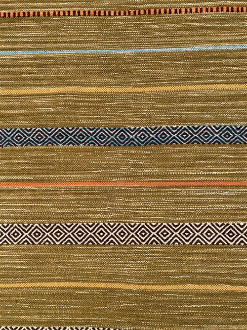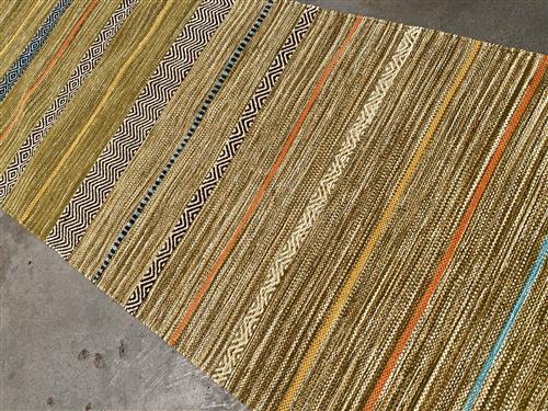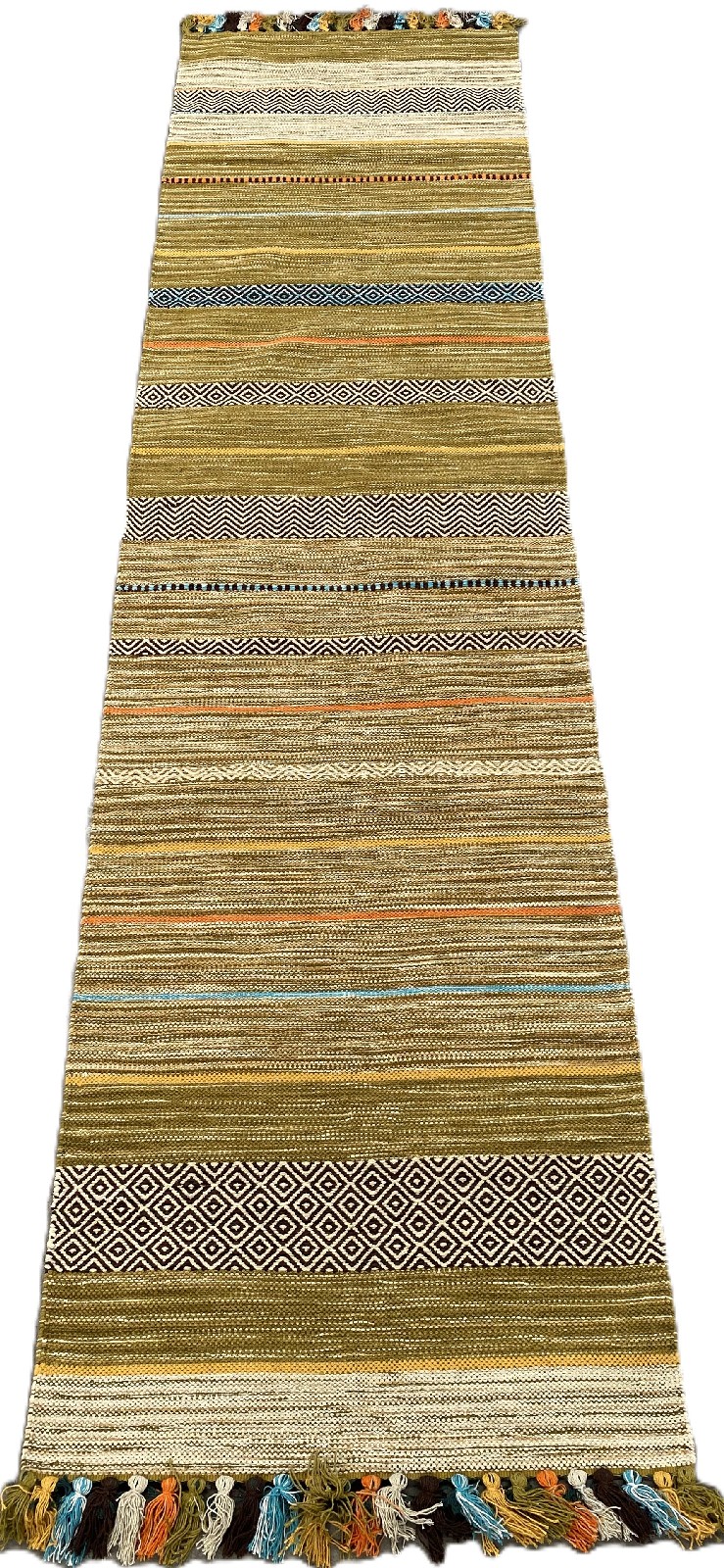 A NEW COLOURFUL, HAND-WOVEN RAJASTHANI KILIM CHENILLE FLEECE RUNNER WITH TASSEL FRINGES. ORIGIN: INDIA (300 X 80 CM) (PLEASE NOTE THERE MAY BE SOME COLOUR VARIATION FROM PHOTOGRAPH)