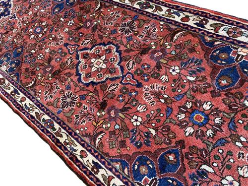 A HARD-WEARING PERSIAN MEHRABAN HALL RUNNER, 100% PLUSH SOLID WOOL PILE. IN EXCELLENT CONDITION. HAND-KNOTTED WEAVE WITH TRADITIONAL DESIGN OF TRIPLE ELONGATED MEDALLIONS IN A CRIMSON FIELD OF FLORAL SPRAYS. BORDER OF FLORAL MOTIFS SIZE: 295 X 80 CM ORIGIN: IRAN