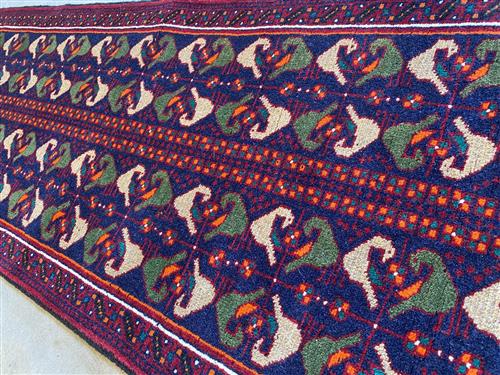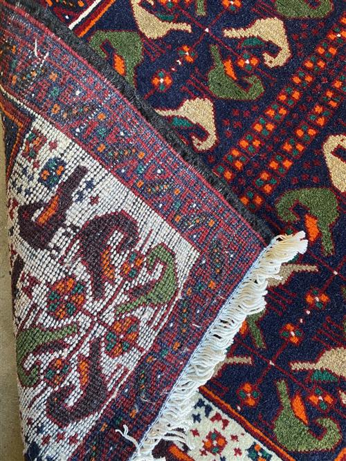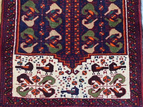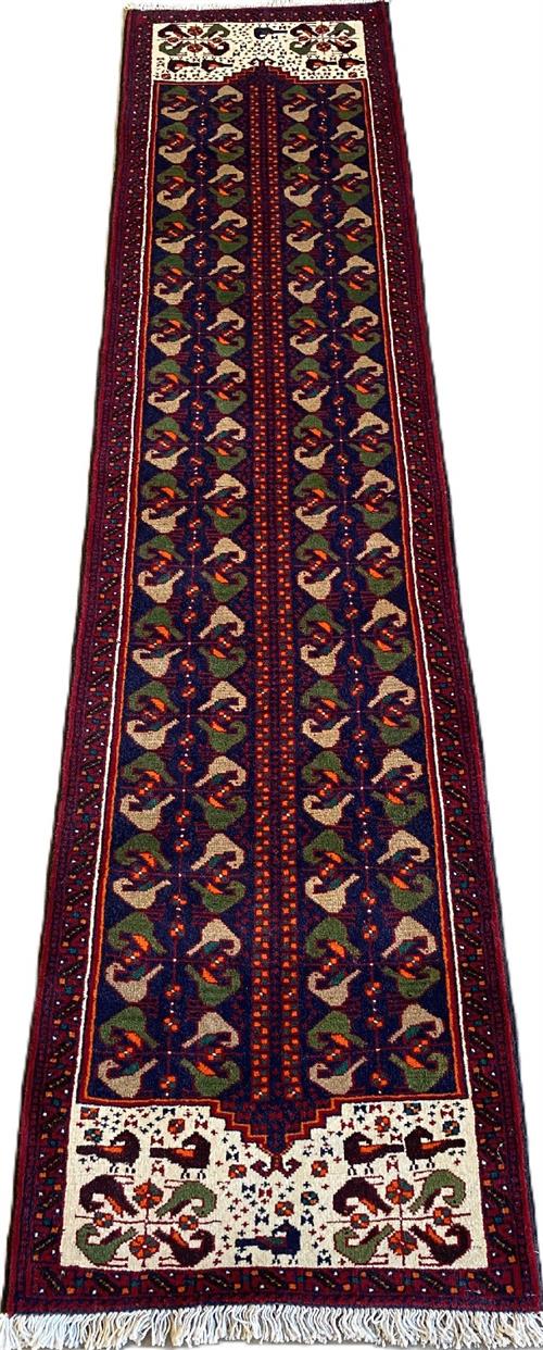 A NEW TRIBAL PERSIAN BALOUCH PEACOCK DESIGN 100% WOOLEN RUNNER. FINELY HAND-KNOTTED TRIBAL WEAVE WITH TRADITIONAL DESIGN PEACOCK MOTIFS FORMING FLORAL PATTERNS IN A BLUE-TONED FIELD. PEACOCK FORMS IN CORNER MEDALLIONS. ORIGIN: IRAN (274 X 63 CM) (PLEASE NOTE THERE MAY BE SOME COLOUR VARIATION FROM PHOTOGRAPH)