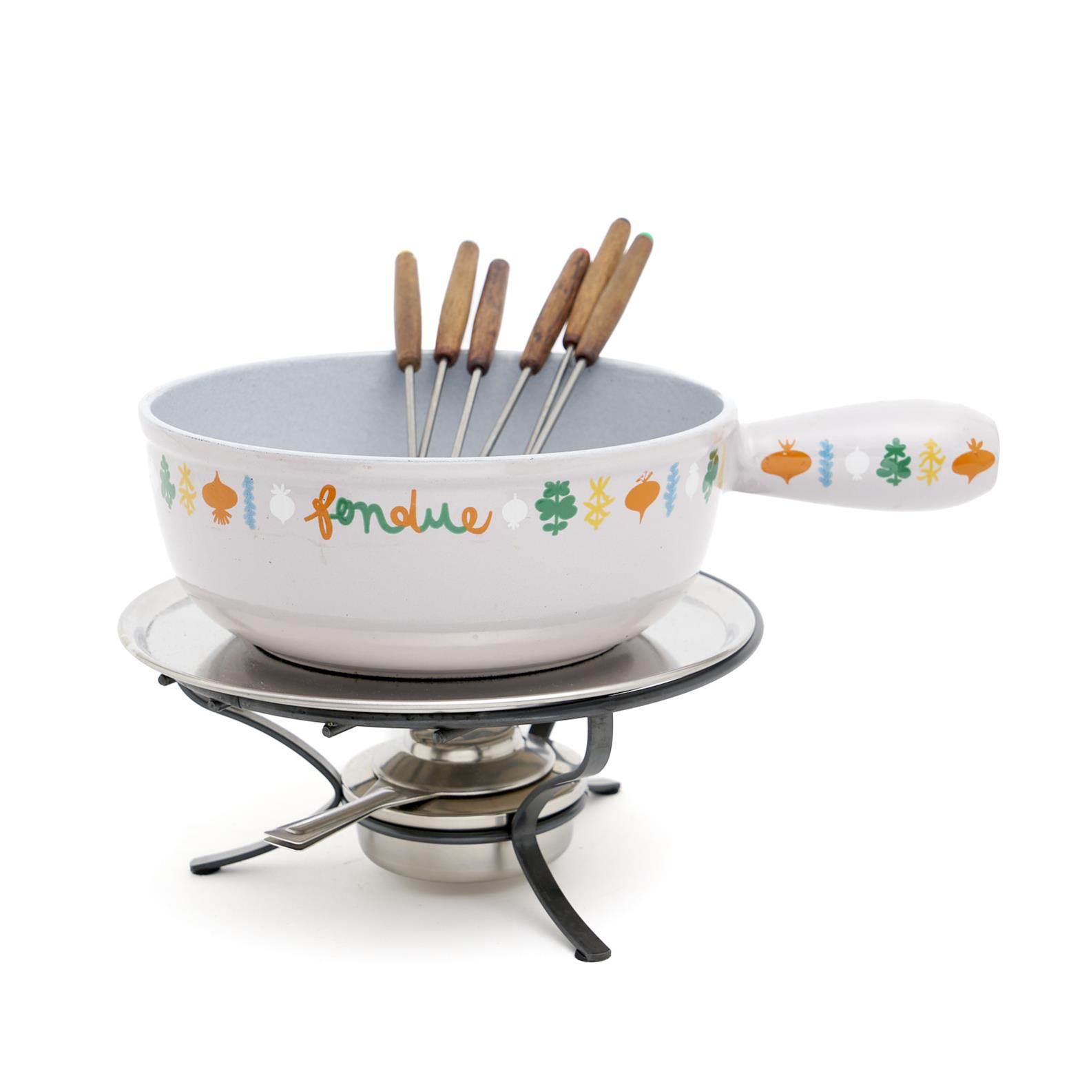 A FRENCH LE CREUSET ENAMELLED CAST-IRON FONDUE PAN AND SPIRIT STOVE DIA.22CM, LEONARD JOEL DELIVERY SIZE: SMALL