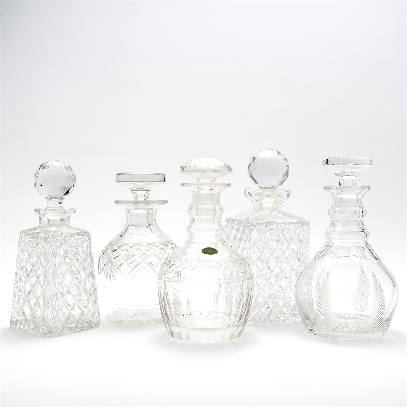 A COLLECTION OF FIVE CUT CRYSTAL DECANTERS INCLUDING STUART H.25CM (TALLEST), LEONARD JOEL DELIVERY SIZE: LARGE
