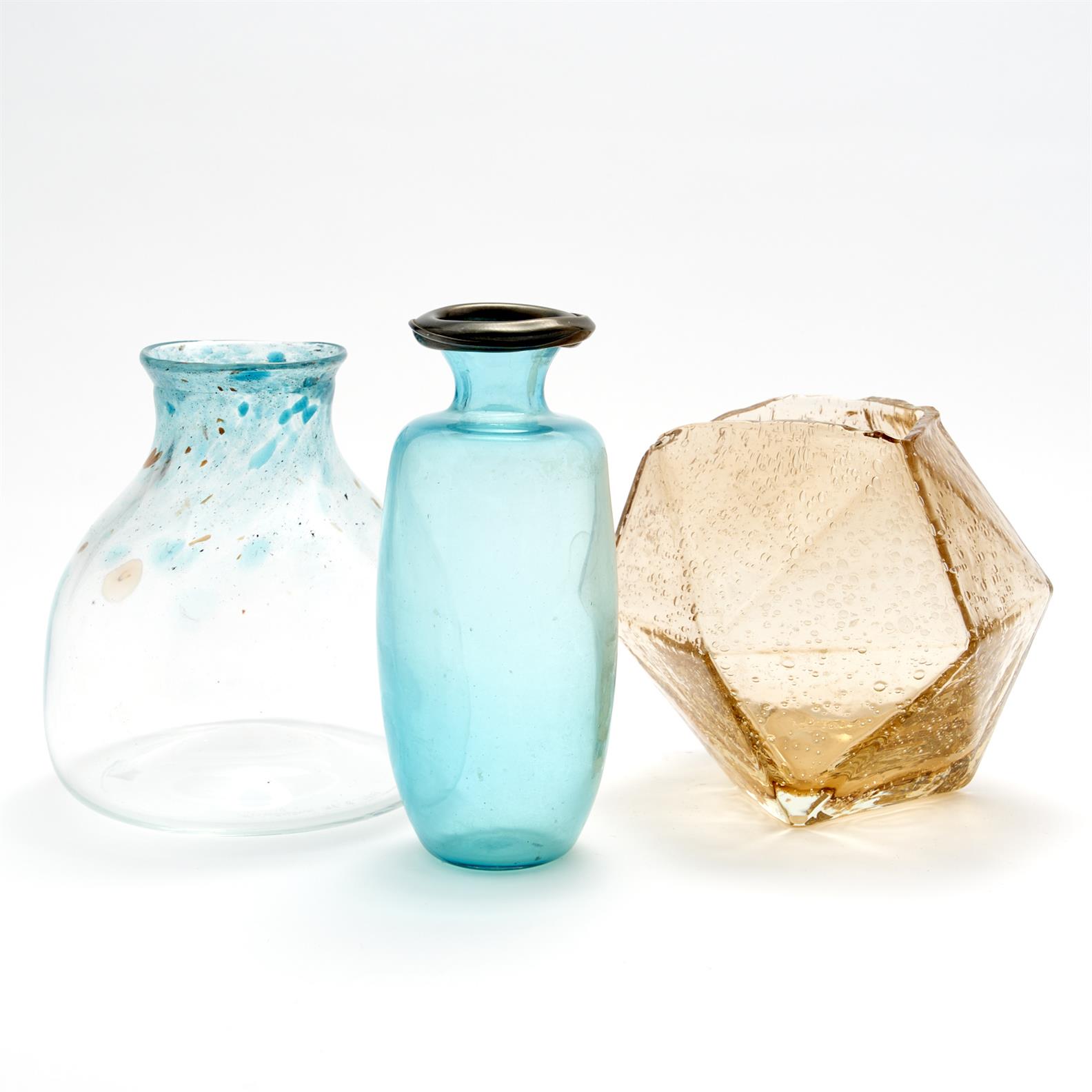 THREE ART GLASS VASES, ONE SIGNED 'BILL BLANSHARD' ANOTHER SIGNED ILLEGIBLE, THE THIRD OF FACETED FORM H.18.5CM, LEONARD JOEL DELIVERY SIZE: MEDIUM