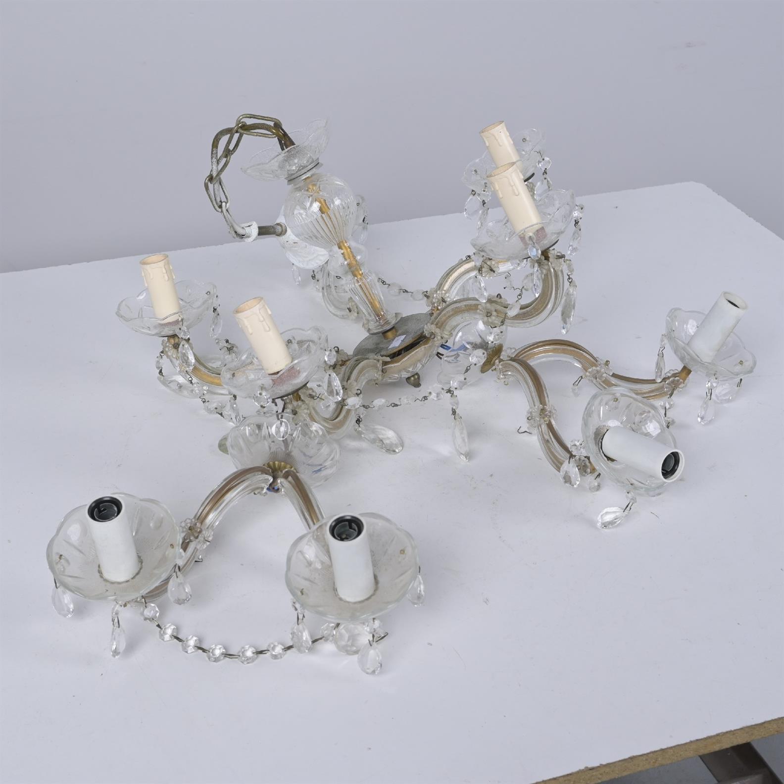 A SIX BRANCH GLASS CHANDELIER WITH TWO GLASS SCONCES (A/F) (62 DROP X 50DIA CM) (LEONARD JOEL DELIVERY SIZE: LARGE)