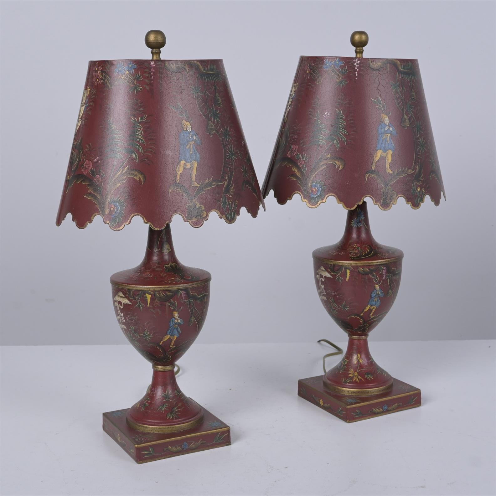 A PAIR OF PAINTED TOLE TABLE LAMPS IN ANTIQUE MANNER, WITH MATCHING SHADES (58H X 27W X 23D CM) (LEONARD JOEL DELIVERY SIZE: MEDIUM)