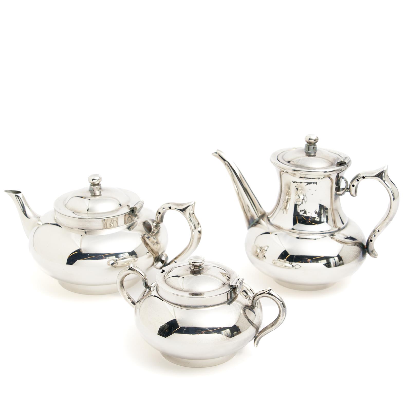 A ROBUR SILVER PLATE TEA POT TOGETHER WITH A STRACHAN SILVER PLATE HOT WATER POT AND SUGAR BOWL H.17CM (TALLEST), LEONARD JOEL DELIVERY SIZE: MEDIUM