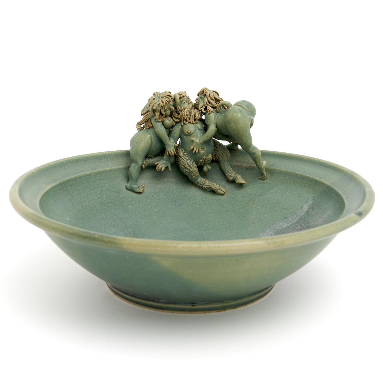 A KURT AND HEIDI BECKER STUDIO POTTERY BOWL WITH SATYR AND DEVIL NYMPHS DIA.32CM LEONARD JOEL DELIVERY SIZE: MEDIUM