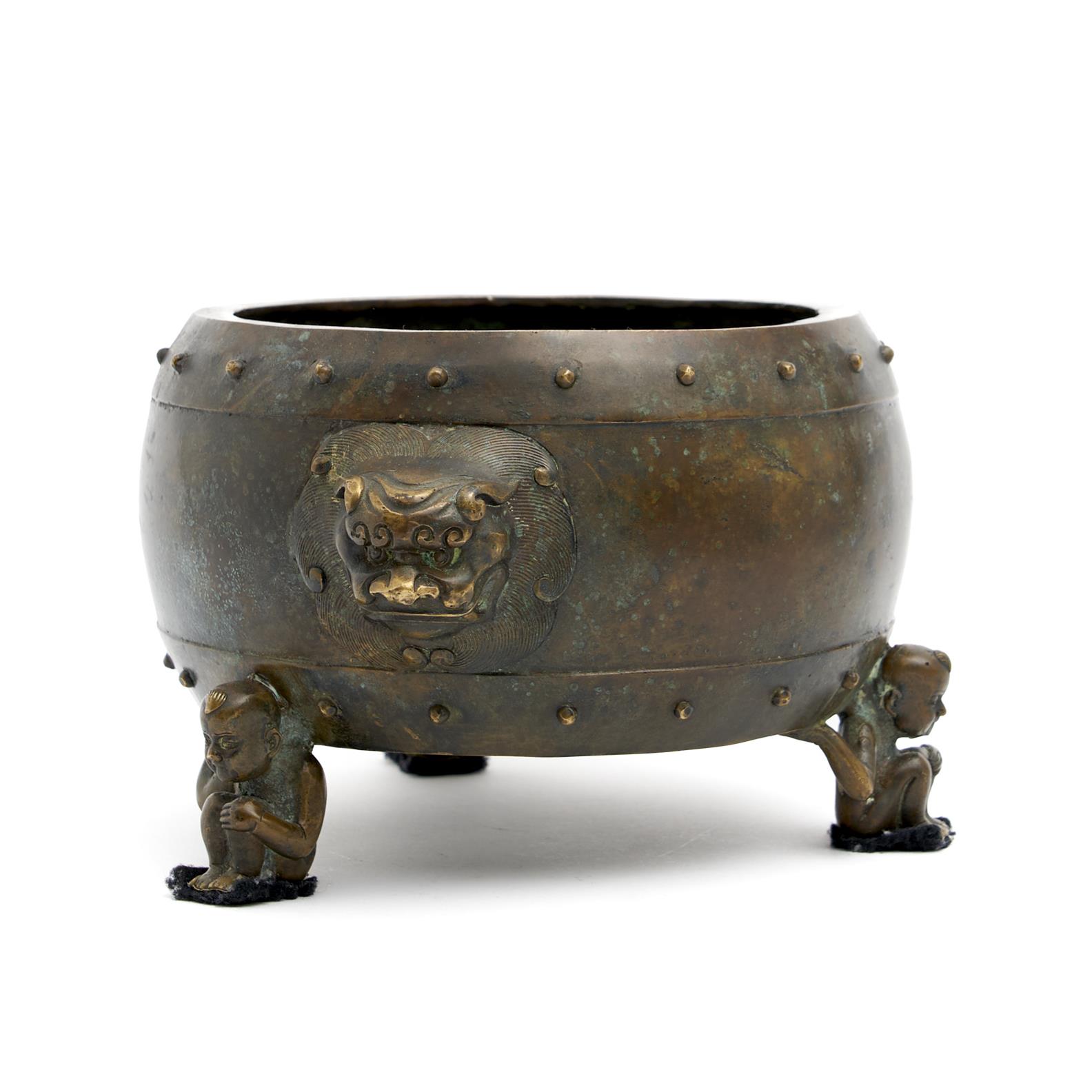 A BRONZE STUDDED BOWL WITH DRAGON HANDLES AND SET UPON THREE FEET DIA.21CM, LEONARD JOEL DELIVERY SIZE: MEDIUM