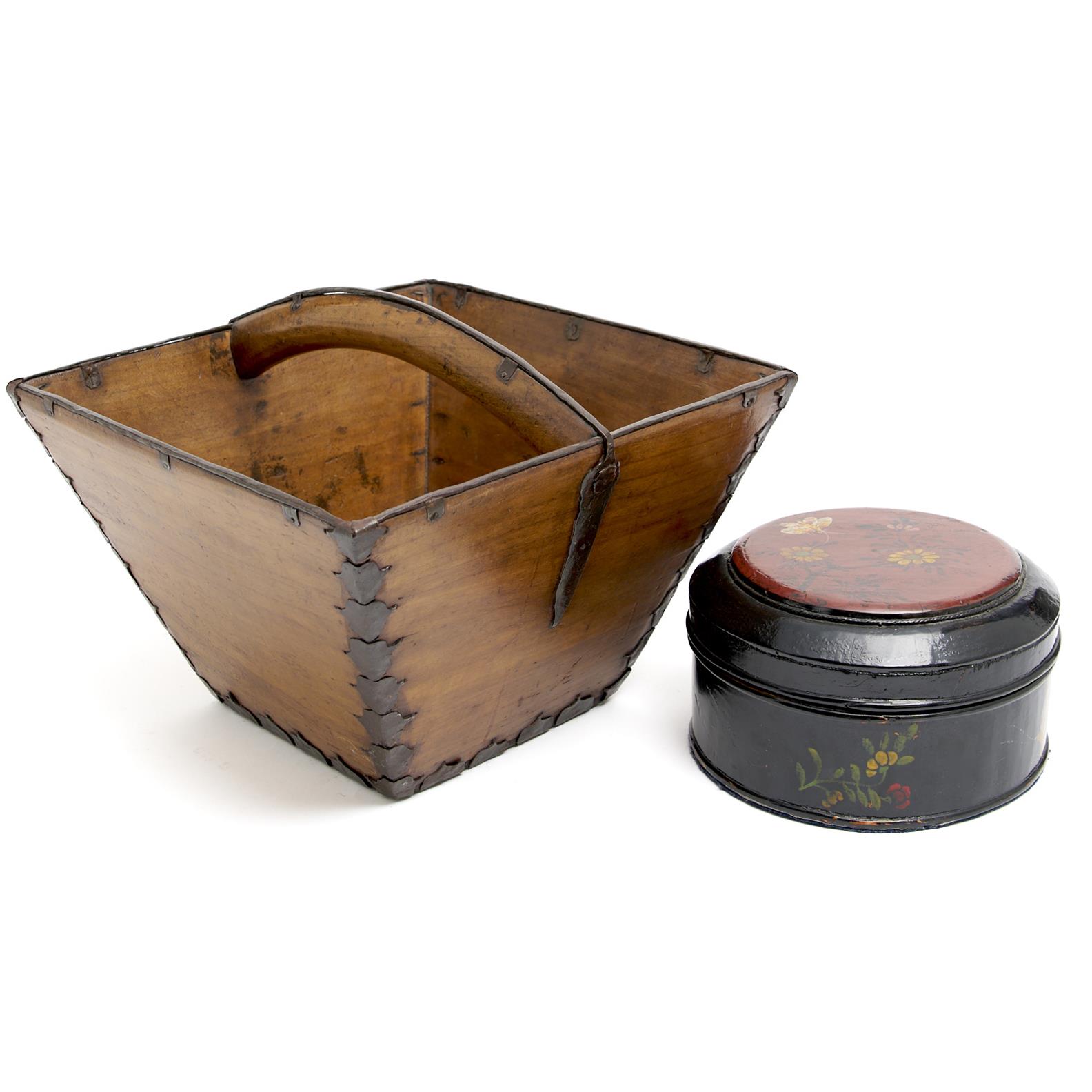 A VINTAGE RICE MEASURE TOGETHER WITH A VINTAGE LAQUERED CONTAINER WITH BUTTERFLY DECORATION W.39CM (LARGEST), LEONARD JOEL DELIVERY SIZE LARGE