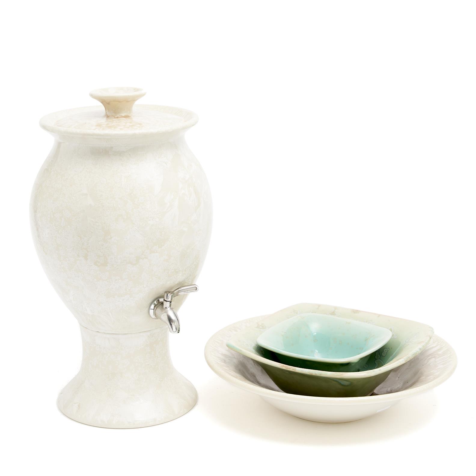 FOUR PIECES OF CRYSTALINE GLAZE CERAMICS INCLUDING A WATER URN AND A LARGE DISH BY ROD PAGE TOGETHER WITH TWO OTHER BOWLS H.49CM (TALLEST), LEONARD JOEL DELIVERY SIZE: LARGE