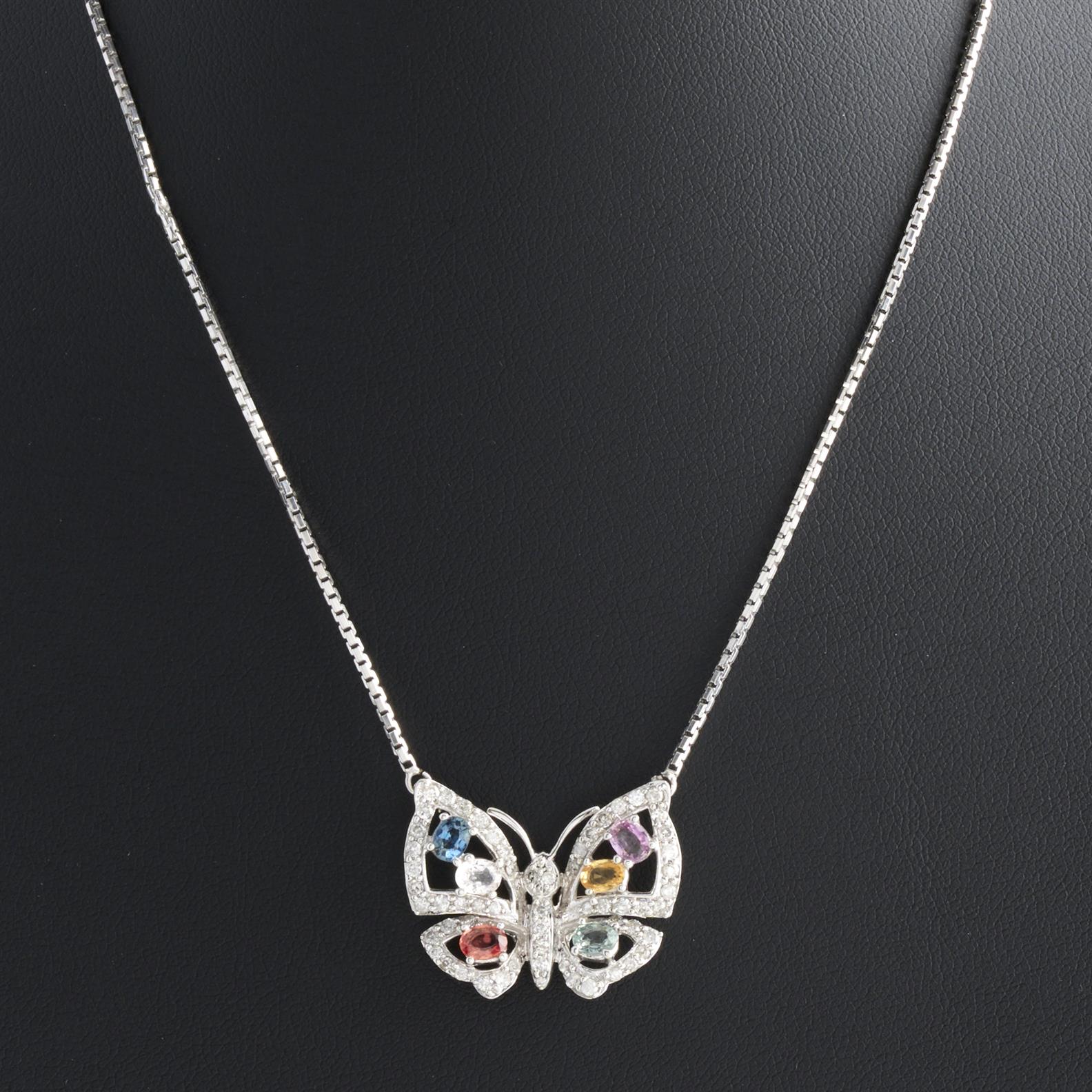 A MULTI-COLOUR SAPPHIRE AND DIAMOND BUTTERFLY PENDANT NECKLACE IN 18CT WHITE GOLD, PENDANT 20 X 25MM, 360MM