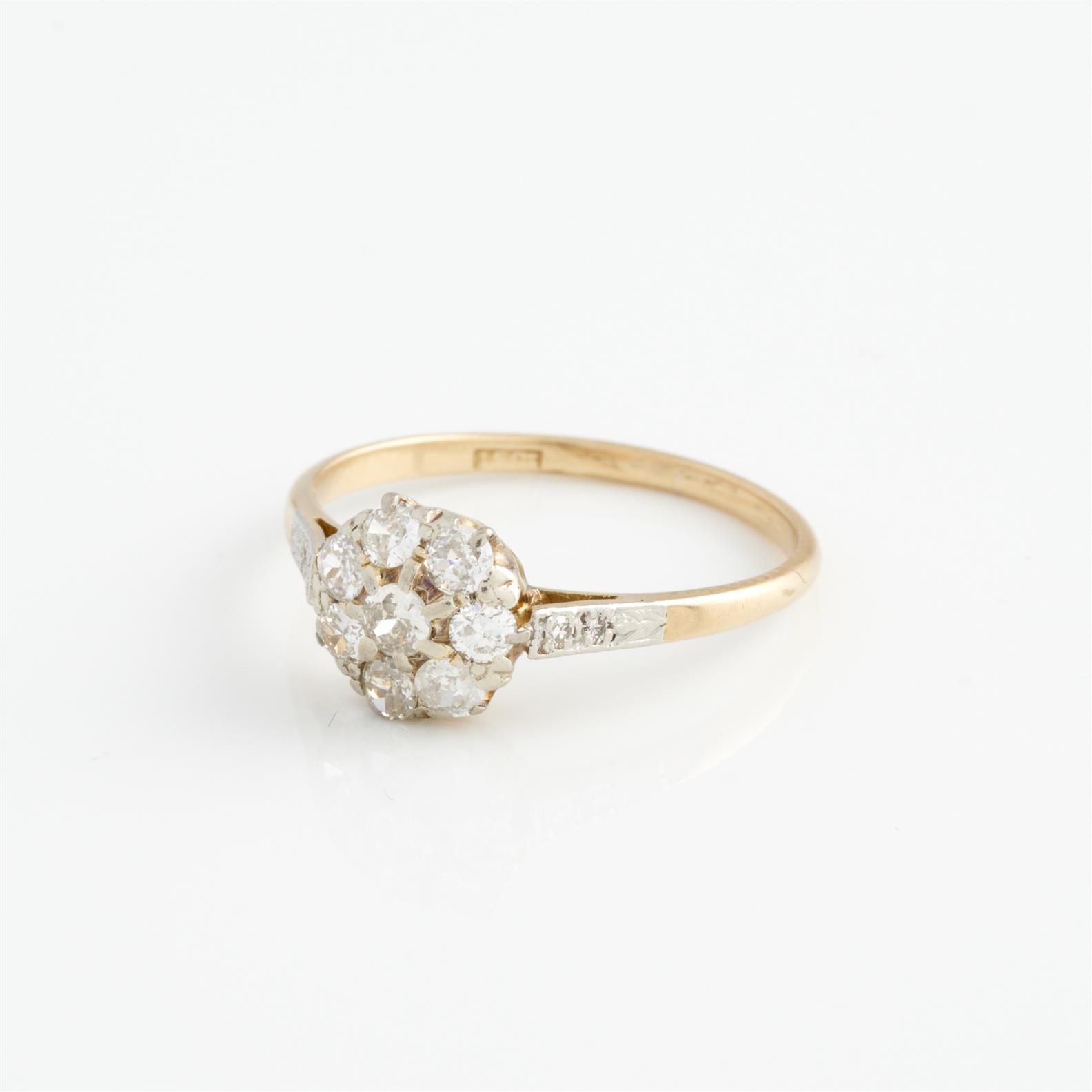 AN ANTIQUE DIAMOND RING IN 15CT TWO-TONE GOLD, THE OLD EUROPEAN DIAMONDS TOTALLING APPROXIMATELY 0.54CT, SIZE S, 2.3GMS