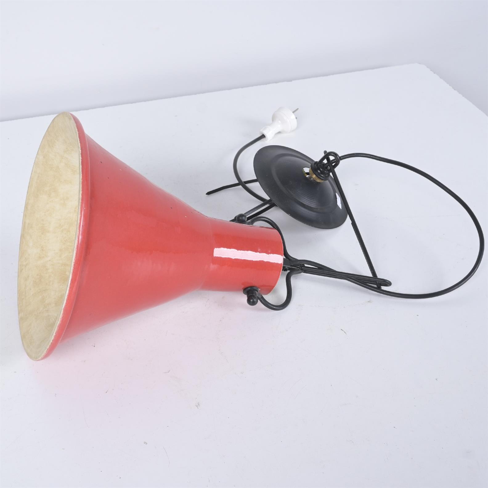 A RED GLAZED CERAMIC PENDANT LIGHT (100 DROP X 30DIA CM) (LEONARD JOEL DELIVERY SIZE: MEDIUM)