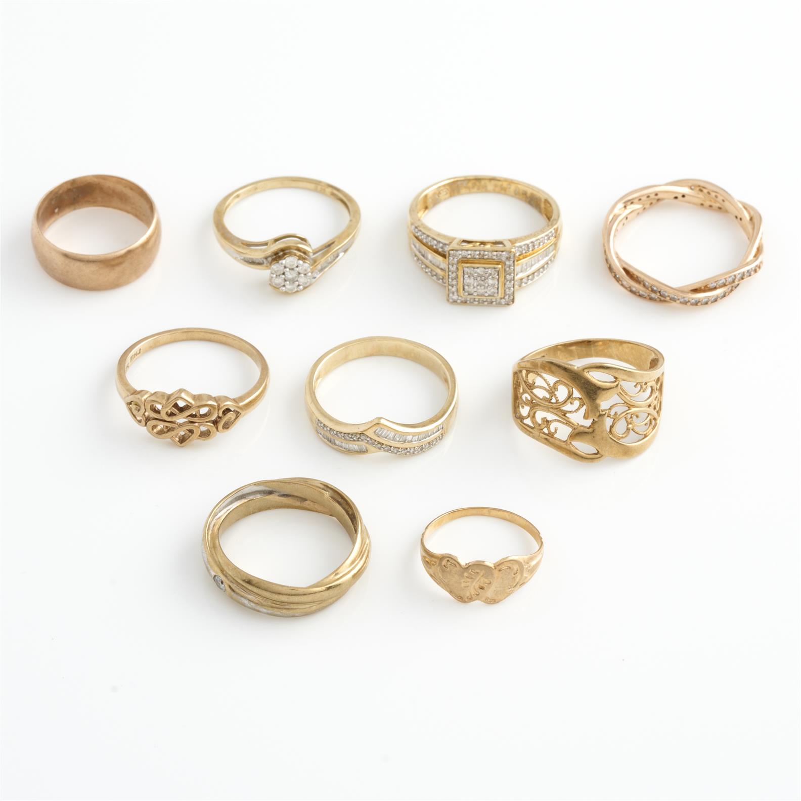 A COLLECTION OF TEN RINGS IN 9CT GOLD, SOME DIAMOND SET, SIZES H - Q, 29.4GMS