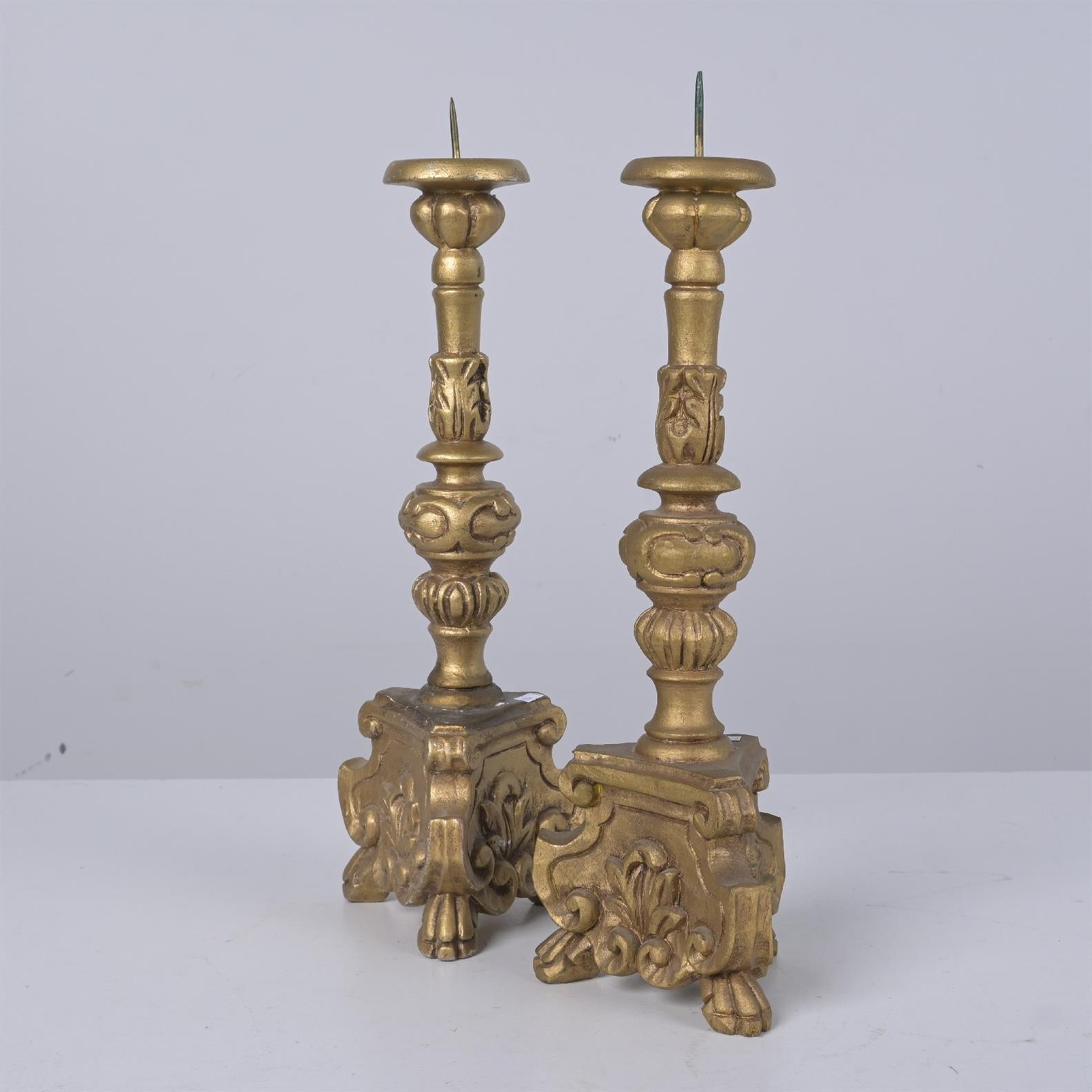 A PAIR OF ANTIQUE-STYLE CARVED AND GILT WOOD CANDLESTICKS (55H X 13DIA CM) (LEONARD JOEL DELIVERY SIZE: MEDIUM(