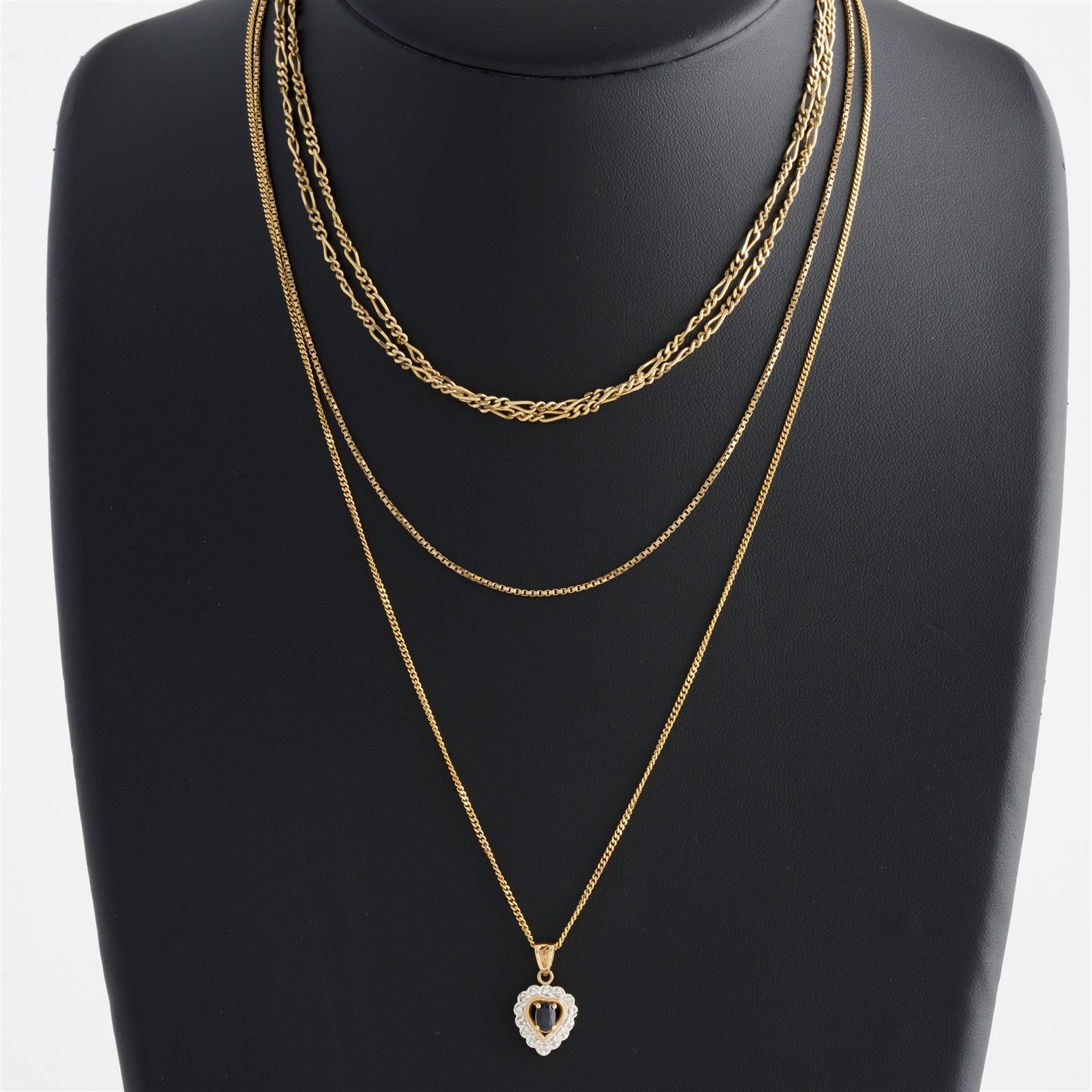 A COLLECTION OF THREE NECKLACES IN 9CT GOLD, ONE SUSPENDING A SAPPHIRE AND DIAMOND PENDANT, LENGTHS 400 - 680MM, TOTAL WEIGHT 12.0GMS