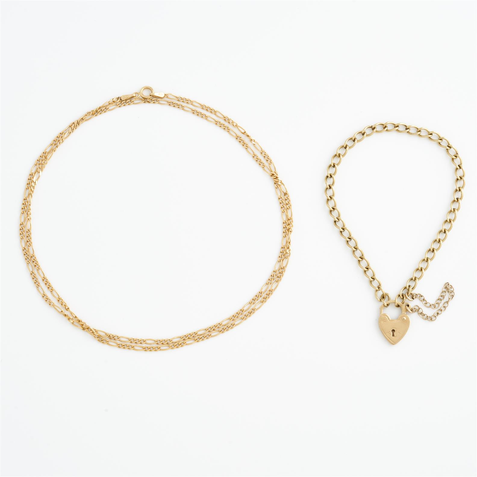 A FIGARO CHAIN IN 9CT GOLD, 540MM, 3.3GMS, TOGETHER WITH A CABLE LINK BRACELET TO A HEART PADLOCK CLASP IN 9CT GOLD, 80MM, 3.9GMS