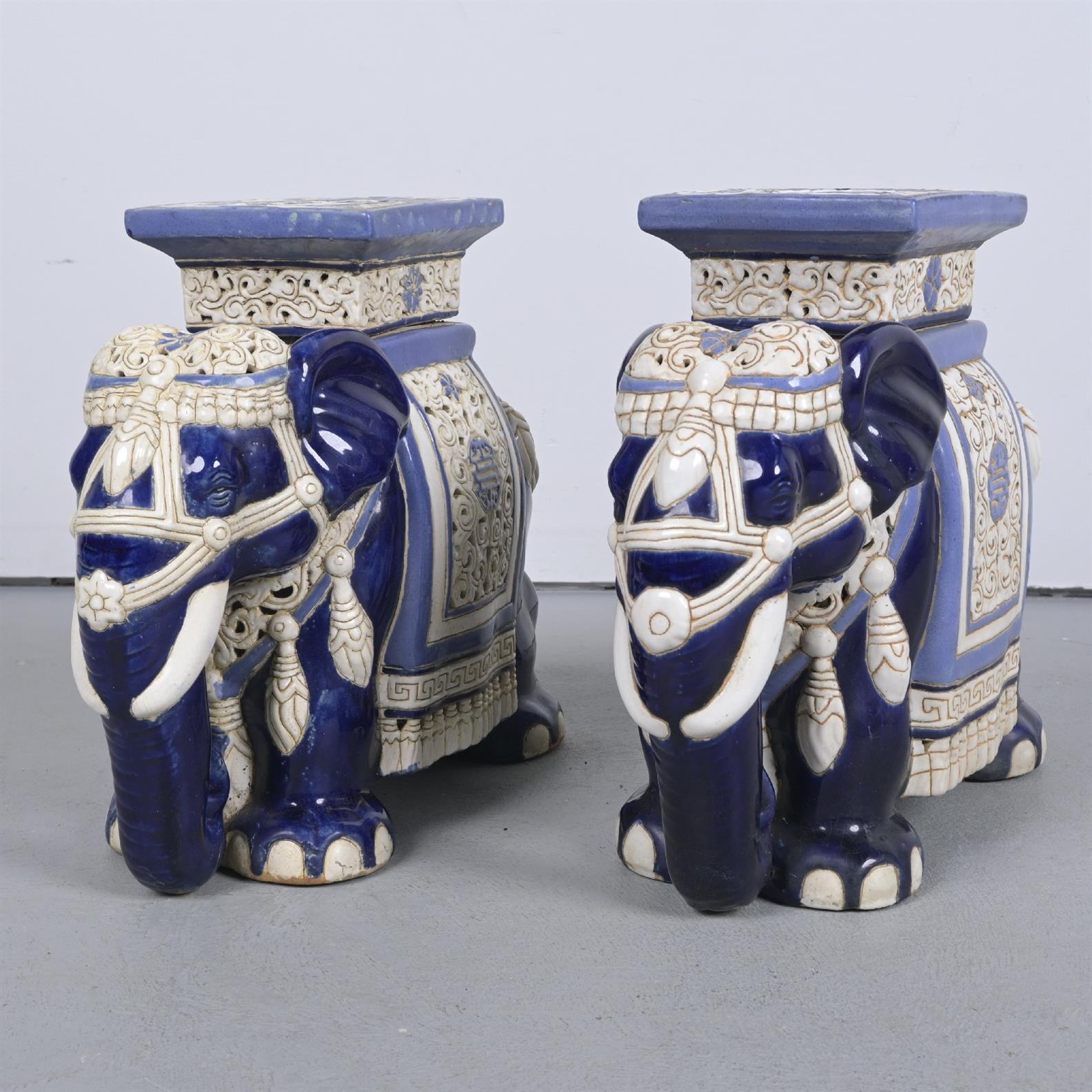 A PAIR OF BLUE AND WHITE CERAMIC ELEPHANT PLANT STANDS (45H X 23W X 45D CM) (LEONARD JOEL DELIVERY SIZE: LARGE)