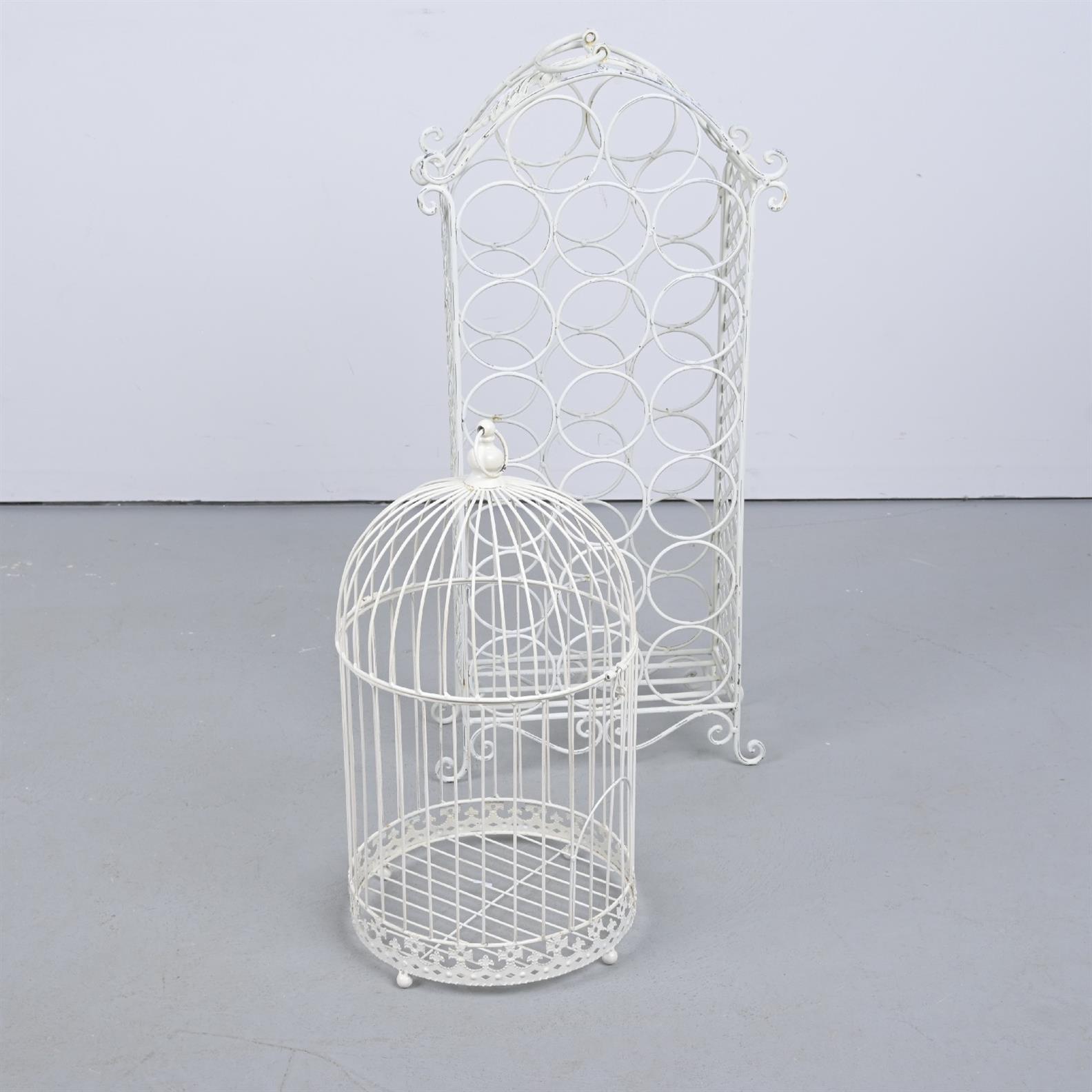 A METAL WINE RACK WITH BIRDCAGE, BOTH PAINTED OFF-WHITE (91H X 41W X 19D CM) (LEONARD JOEL DELIVERY SIZE: LARGE)