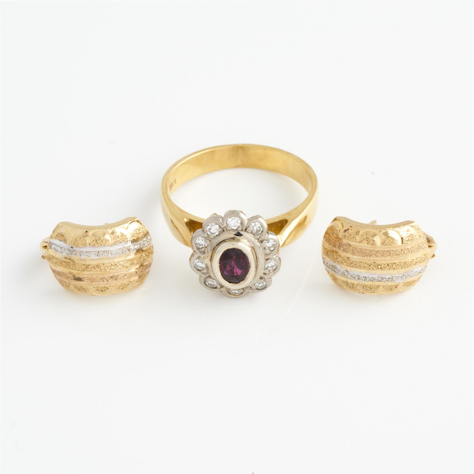 A RUBY AND DIAMOND RING IN TWO-TONE 18CT GOLD, SIZE O, TOGETHER WITH A PAIR OF EARRINGS IN 18CT GOLD, TO POST FITTINGS, 7.4GMS