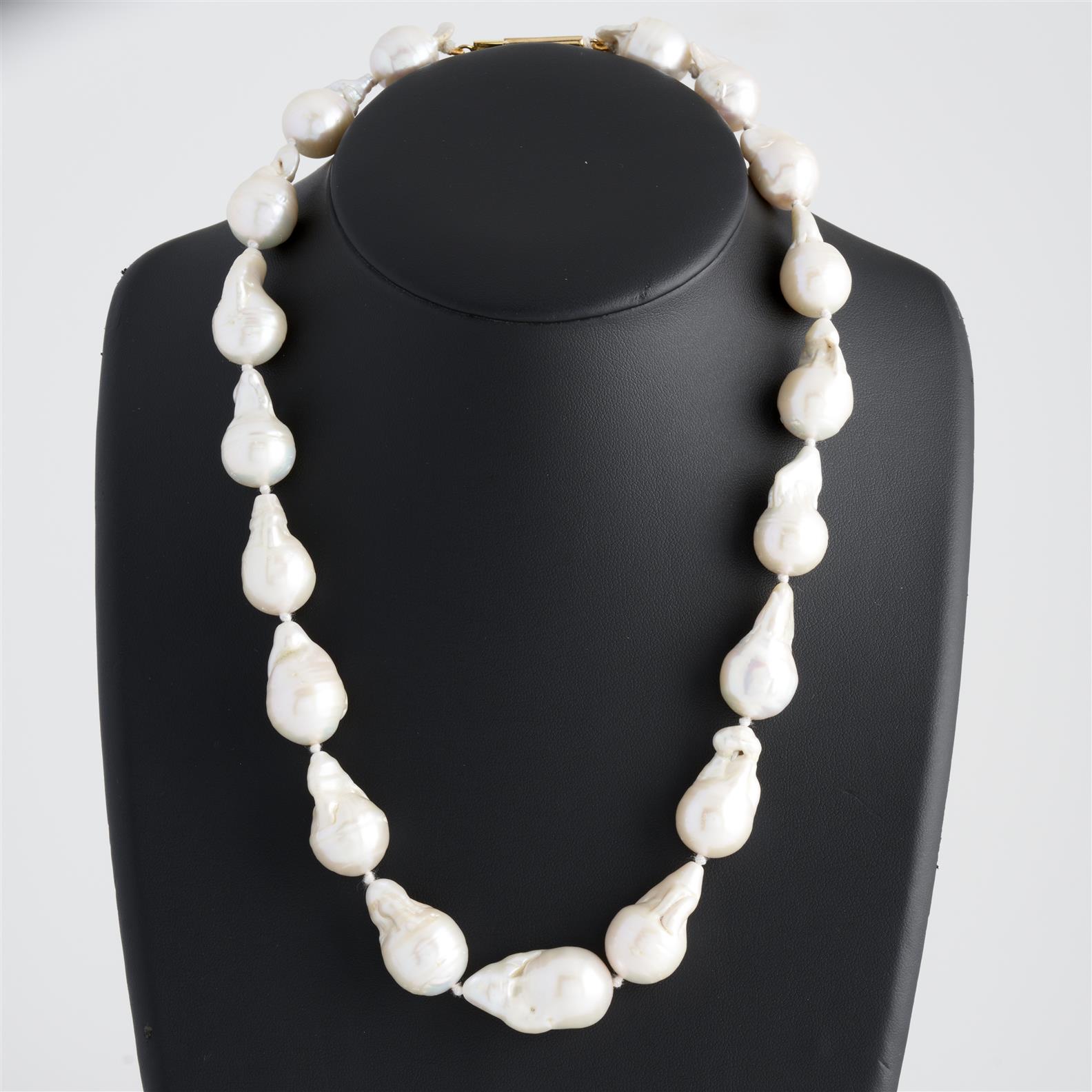 A BAROQUE PEARL NECKLACE, TO A CLASP IN GOLD PLATE, 510MM