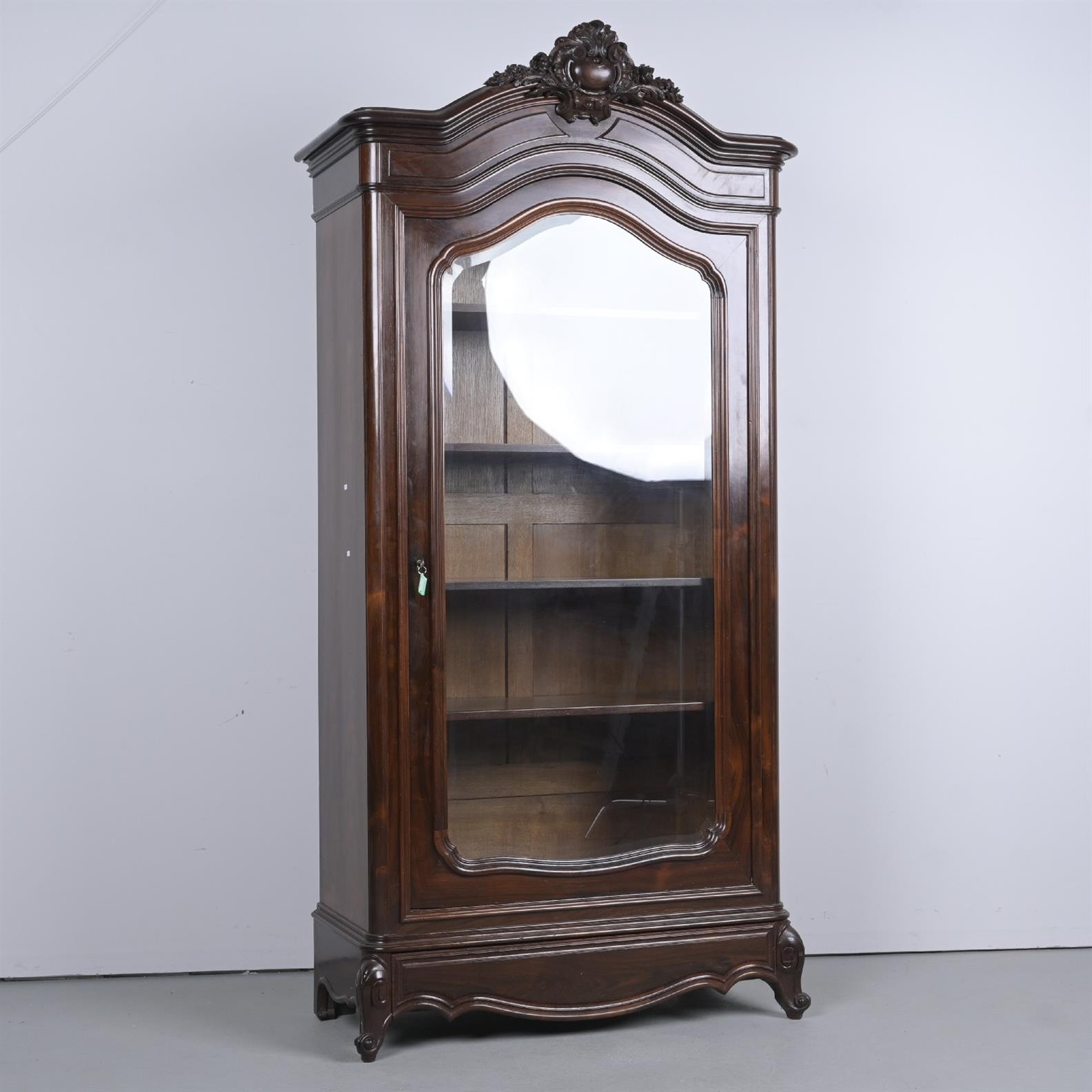 AN 1870s–'80s FRENCH ROSEWOOD AND GLAZED BOOK-CASE, THE INTERIOR LATER FITTED WITH LIGHTING (25H X 115W X 50D CM) (THIS ITEM MUST BE REMOVED BY CARRIERS AT THE CUSTOMER'S EXPENSE. LEONARD JOEL STAFF CANNOT ASSIST CARRYING THIS ITEM)