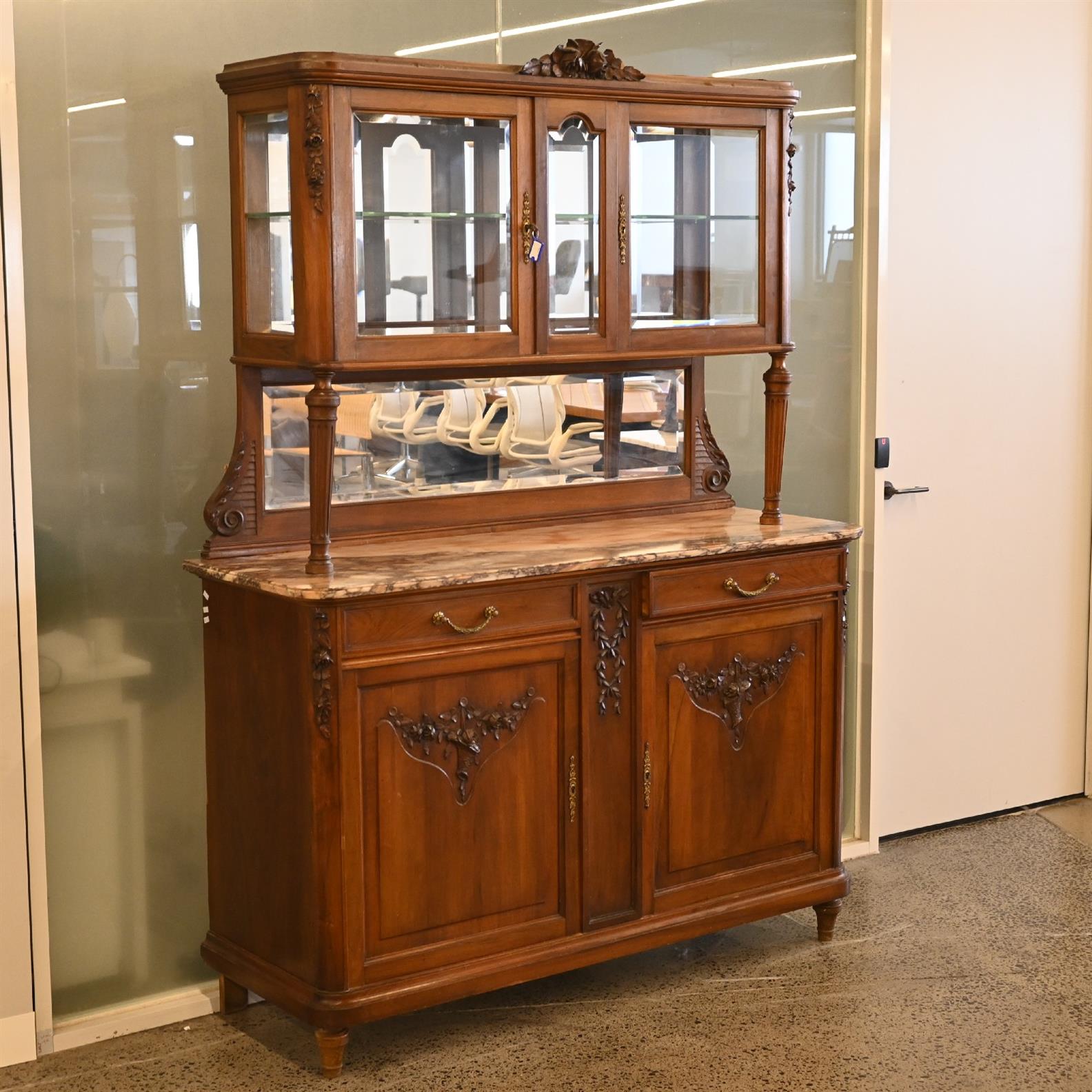 AN EARLY 20th CENTURY FRENCH WALNUT HIGH SIDEBOARD, WITH A PINK-VEINED MARBLE TOP (A/F) (208H X 152W X 54D CM) (THIS ITEM MUST BE REMOVED BY CARRIERS AT THE CUSTOMER'S EXPENSE. LEONARD JOEL STAFF CANNOT ASSIST CARRYING THIS ITEM)