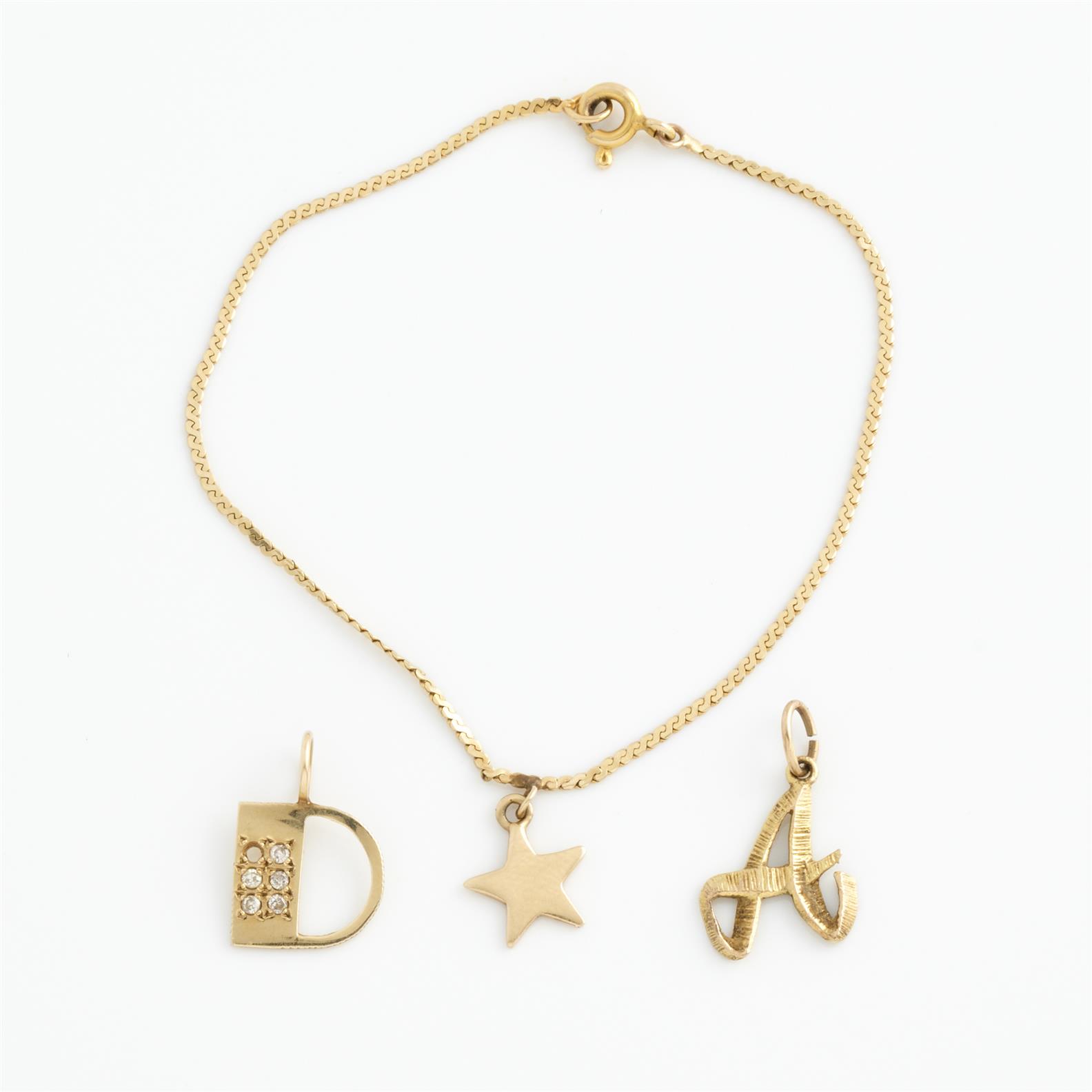 A COLLECTION OF JEWELLERY IN 9CT GOLD, COMPRISING OF A STAR BRACELET, AND TWO PENDANTS, ONE DIAMOND SET, 2.7GMS, A/F (ONE DIAMOND DEFICIENT)