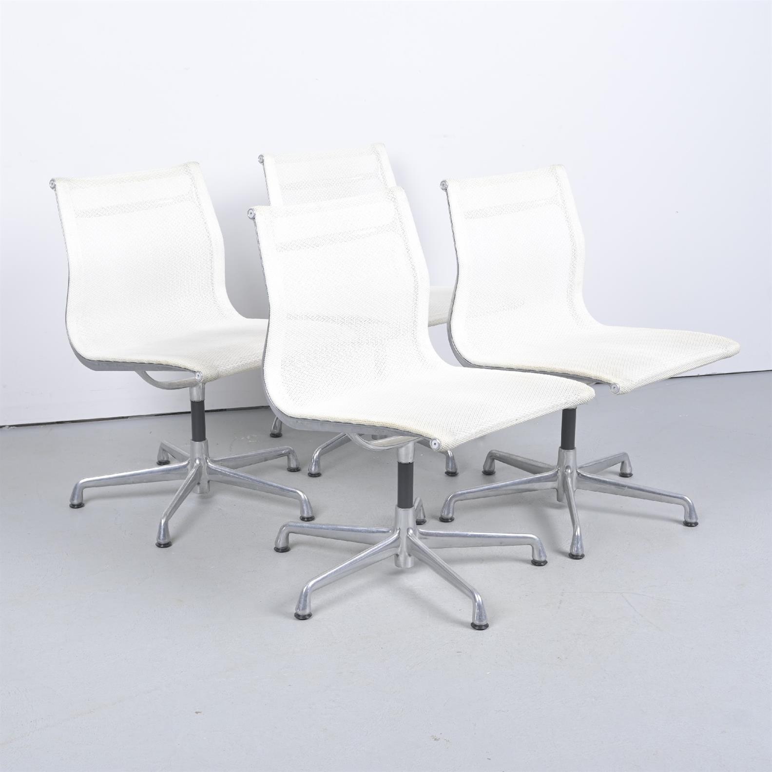 A SET OF FOUR 'AE330' ALUMINIUM AND WHITE MESH SWIVELLING OFFICE CHAIRS BY EAMES FOR HERMAN MILLER (85H X 65DIA CM) (LEONARD JOEL DELIVERY SIZE: X-LARGE)