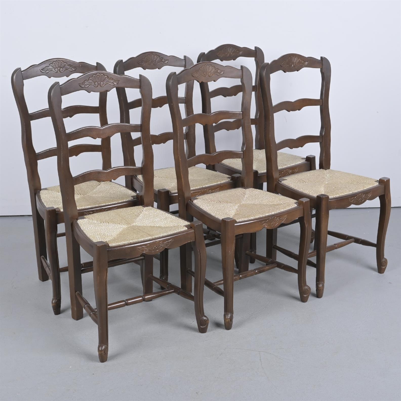 A SET OF PROVINCIAL FRENCH-STYLE STAINED BEECH LADDERBACK CHAIRS, WITH SEAGRASS SEATS (98H X 43W X 42D CM) (LEONARD JOEL DELIVERY SIZE: X-LARGE)