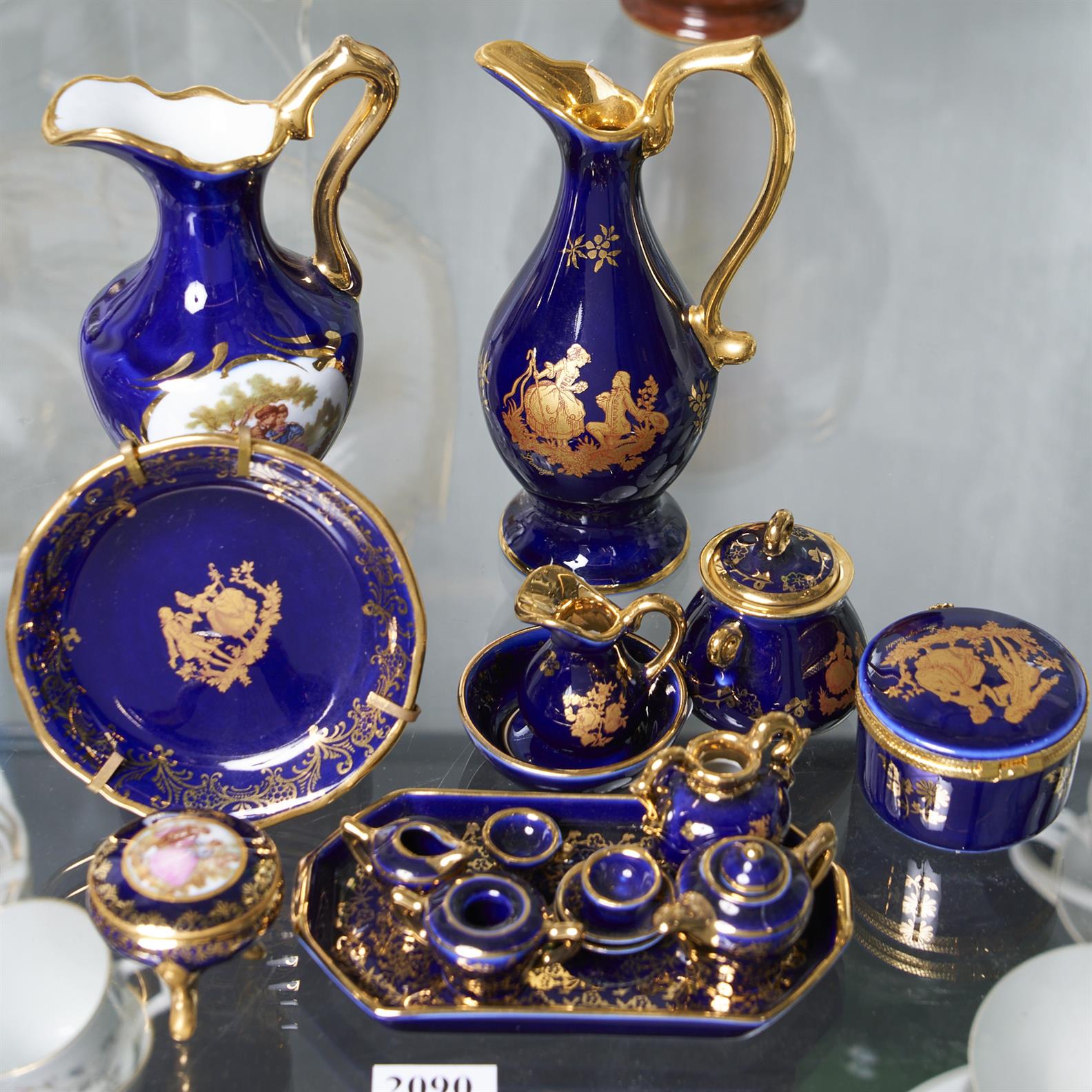 A COLLECTION OF LIMOGES DEEP NAVY GROUND MINIATURE PORCELAIN INCLUDING TWO JUGS, A TEA SET, DISPLAY PLATE, BED PANAND JUG, AND A TRINKET BOX H.14CM (TALLEST), LEONARD JOEL DELIVERY SIZE: MEDIUM