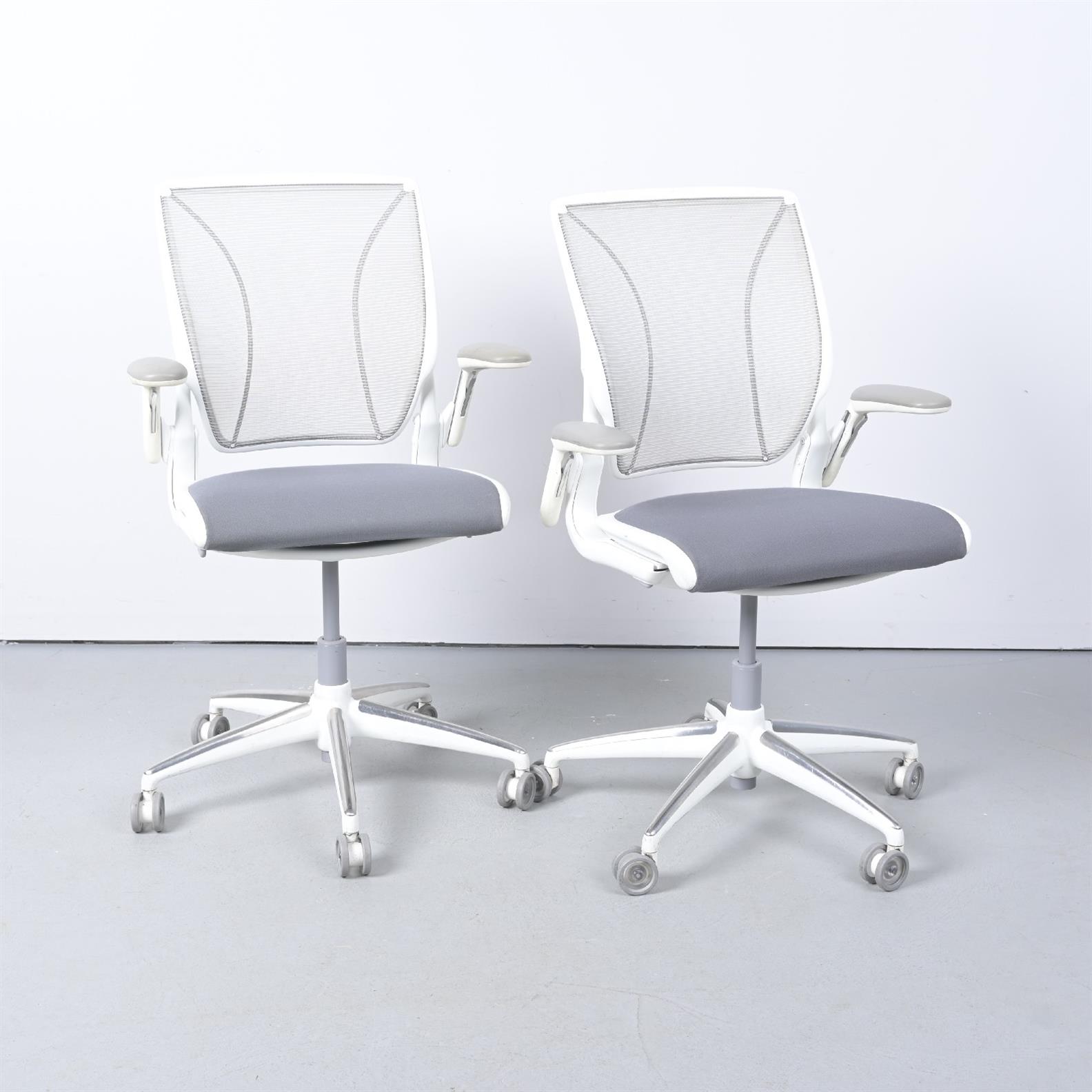A PAIR OF SCHIAVELLO DIFFRIENT WORLD, FULLY ADJUSTABLE DESK CHAIRS. WHITE/POLISHED ALUMINIUM BASE WITH MID GREY FABRIC SEATS AND WHITE MESH BACKS. (106H X 65W X 65D CM) (LEONARD JOEL DELIVERY SIZE: LARGE)