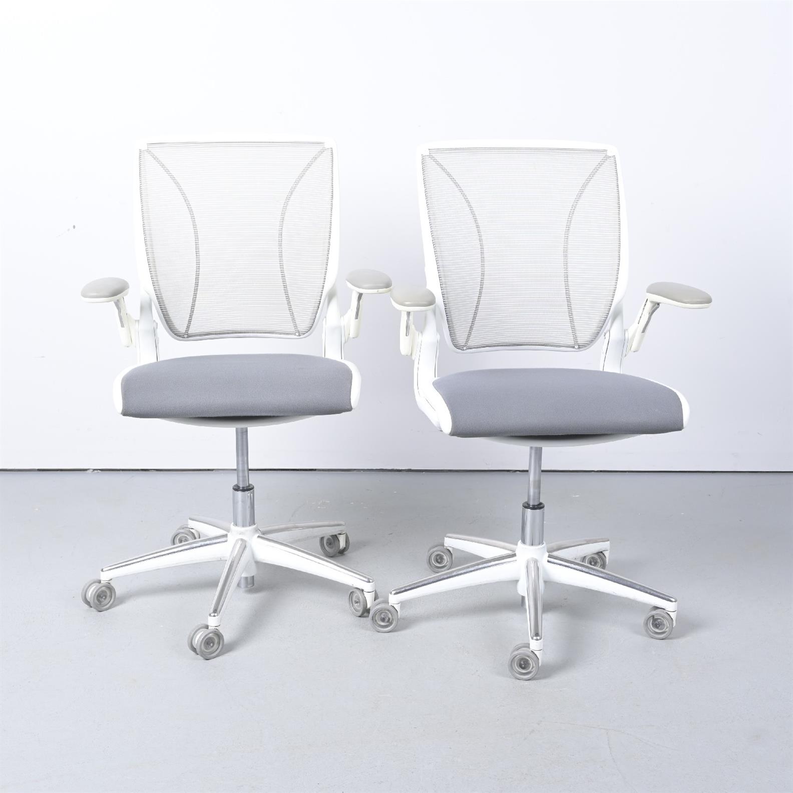 A PAIR OF SCHIAVELLO DIFFRIENT WORLD, FULLY ADJUSTABLE DESK CHAIRS. WHITE/POLISHED ALUMINIUM BASE WITH MID GREY FABRIC SEATS AND WHITE MESH BACKS. (106H X 65W X 65D CM) (LEONARD JOEL DELIVERY SIZE: LARGE)