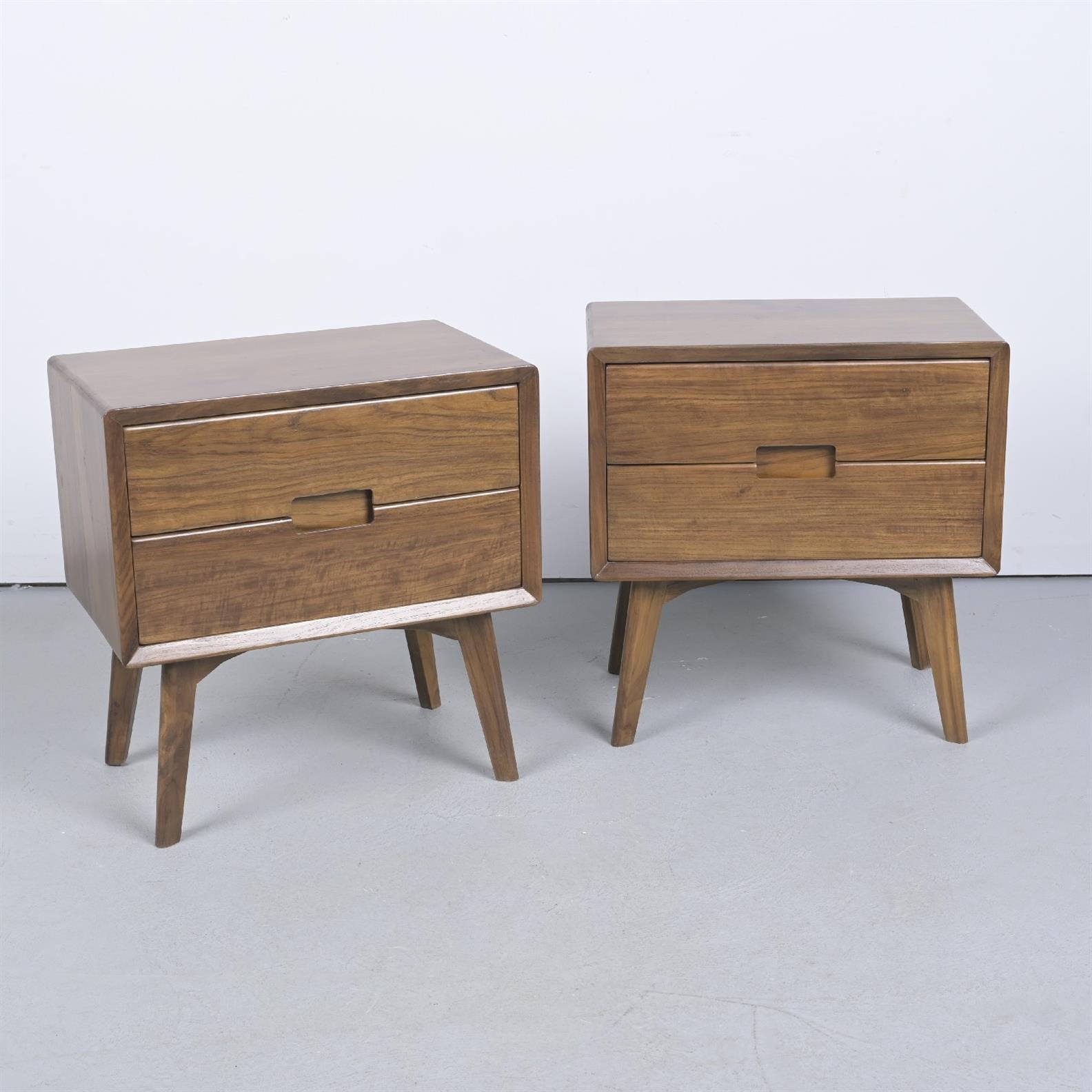 A PAIR OF MID-CENTURY STYLE TEAK BEDSIDE TABLES (63H X 60W X 37D CM) (LEONARD JOEL DELIVERY SIZE: X-LARGE)