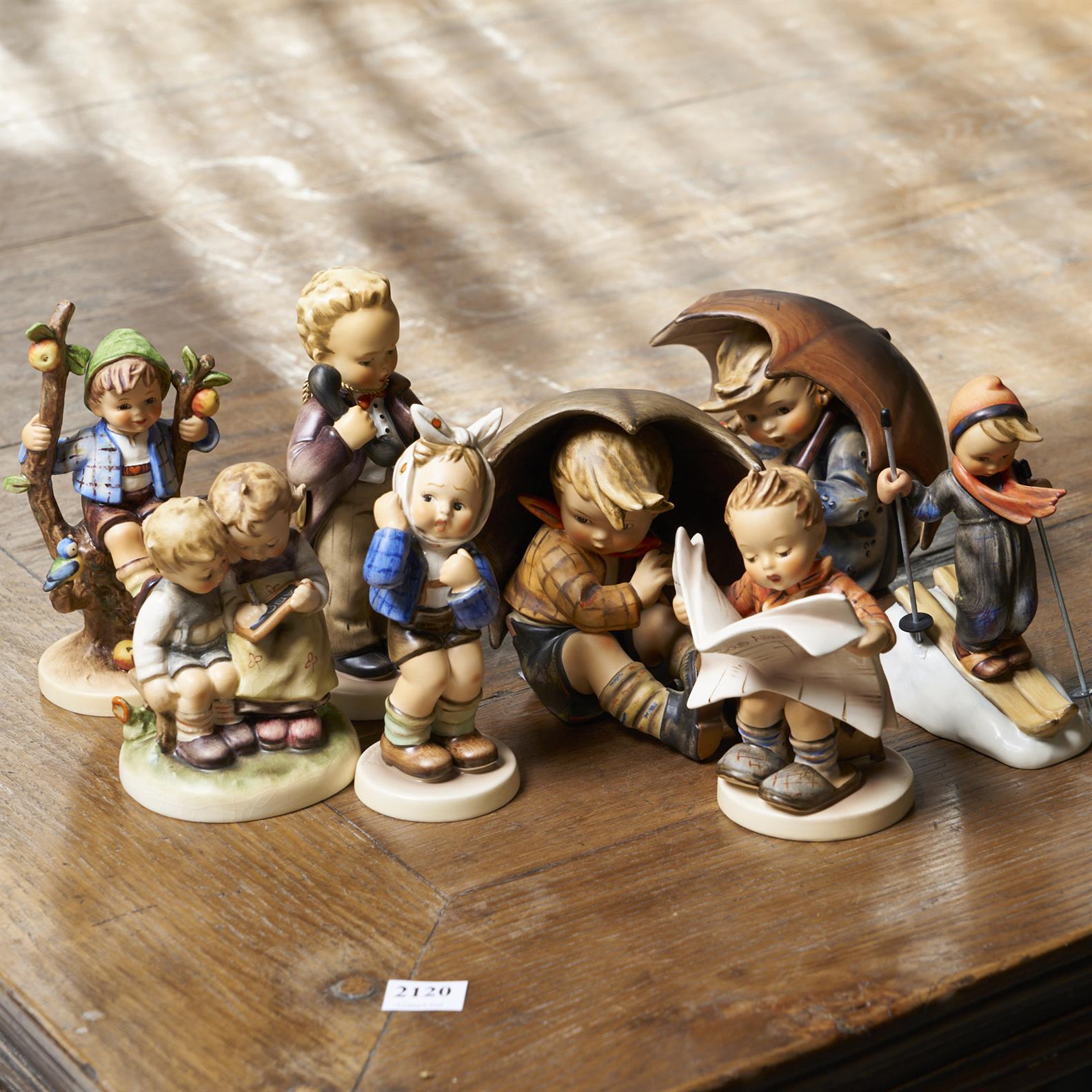 SIX GOEBEL FIGURINES INCLUDING A BOY AND GIRL FIGURAL GROUP, BOY READING, SKIING, AND BOY IN FRUIT TREE TOGETHER WITH A PAIR OF BOYS UNDER UMBRELLAS H.17CM (TALLEST), LEONARD JOEL DELIVERY SIZE: MEDIUM