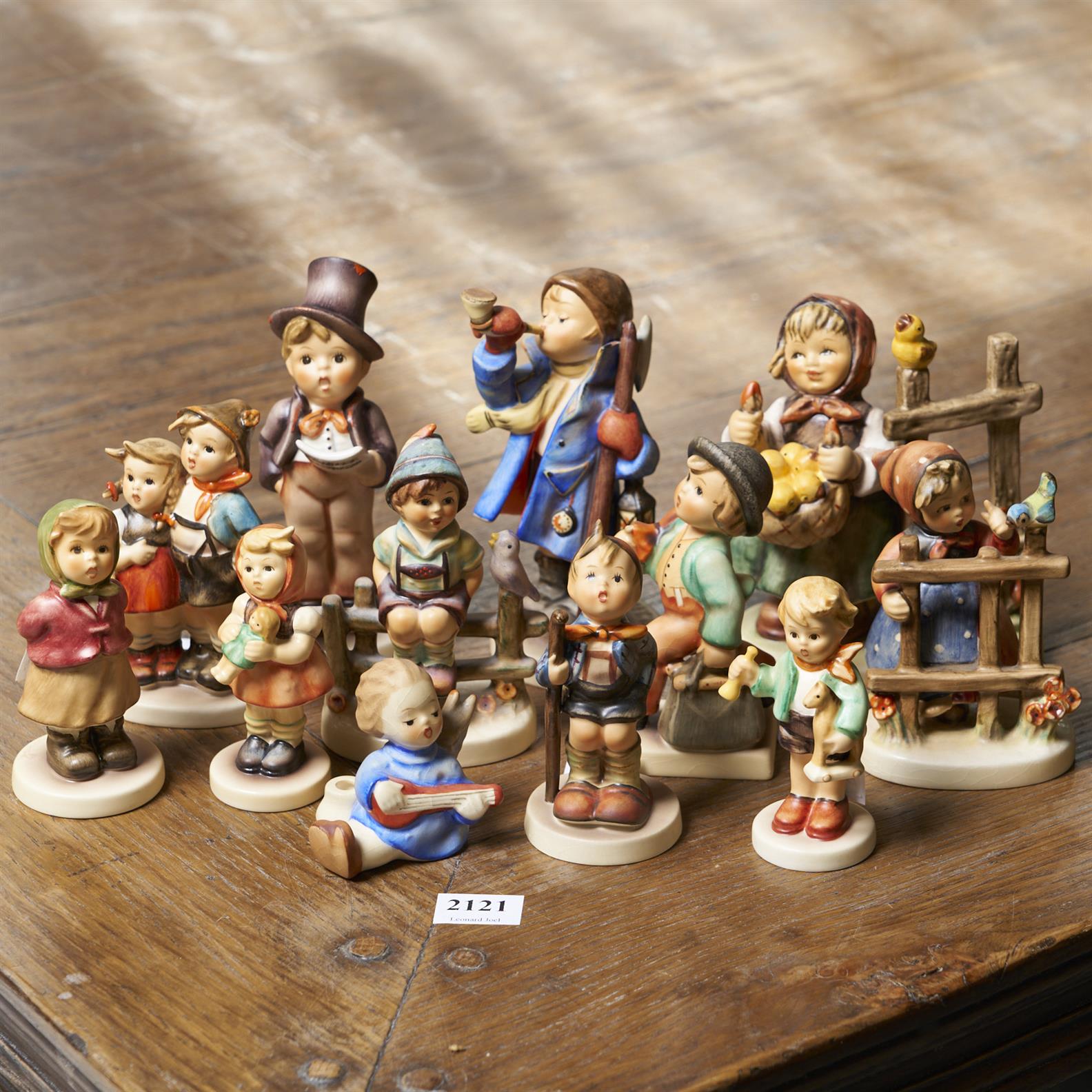 TWELVE GOEBEL FIGURINES INCLUDING A BOY AND GIRL FIGURAL GROUP, BOY WITH WALKING STICK, GIRL WITH CHICKLETS, AND BOY ON FENCE WITH BIRD H.14CM (TALLEST), LEONARD JOEL DELIVERY SIZE: LARGE