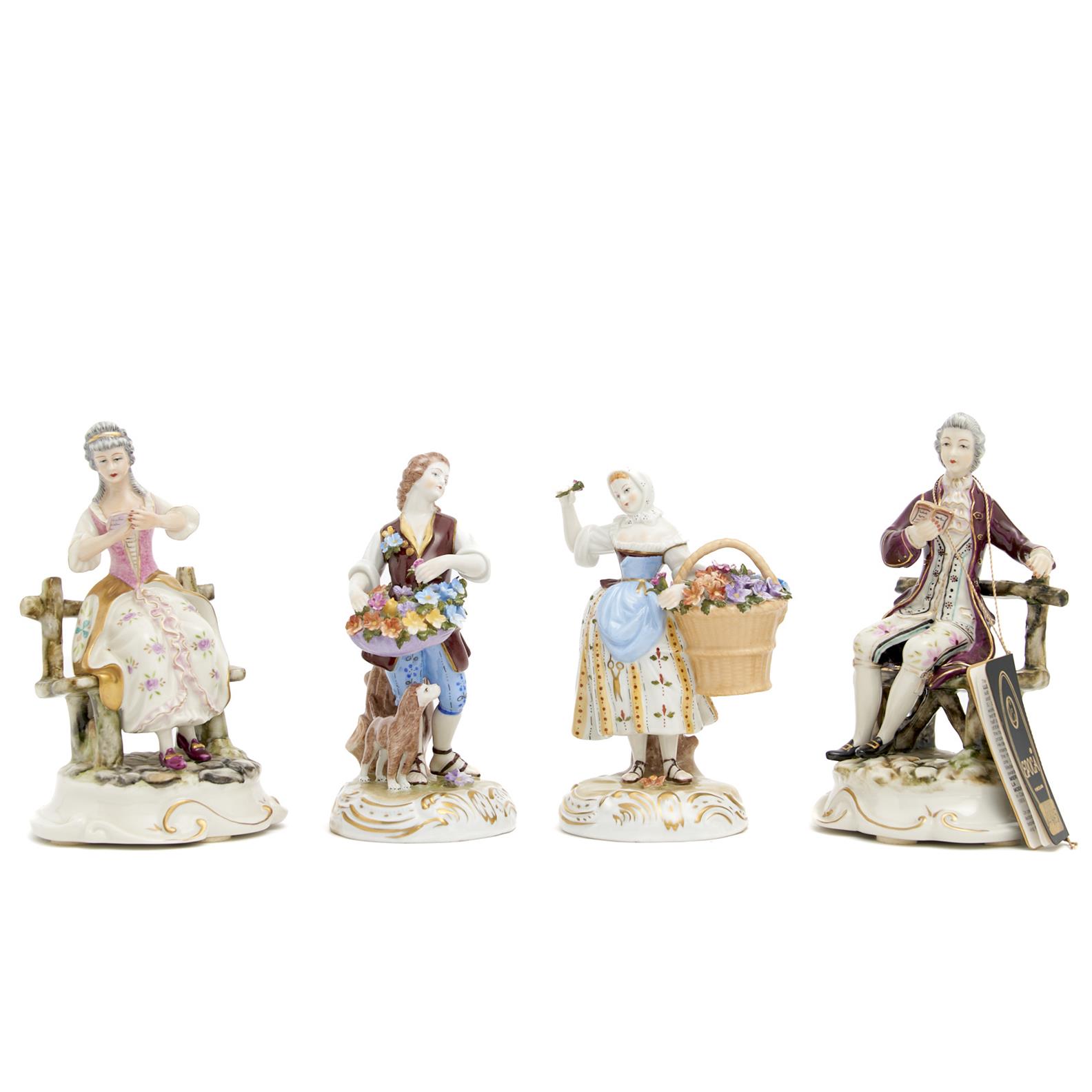 A PAIR OF DRESDEN PORCELAIN FLOWER VENDOR FIGURES TOGETHER WITH A GALOS FIGURES H.17.5CM (TALLEST), LEONARD JOEL DELIVERY SIZE: MEDIUM