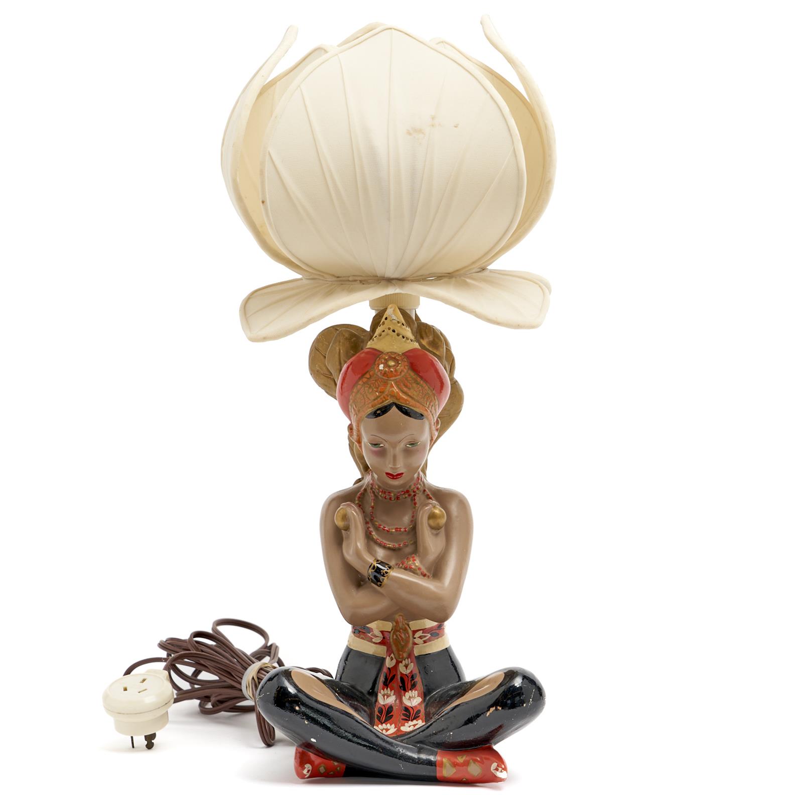 A HAND PAINTED PLASTER INDIAN FIGURAL LAMP WITH SILK LOTUS LEAF SHADE (A/F) H.50CM, LEONARD JOEL DELIVERY SIZE: MEDIUM