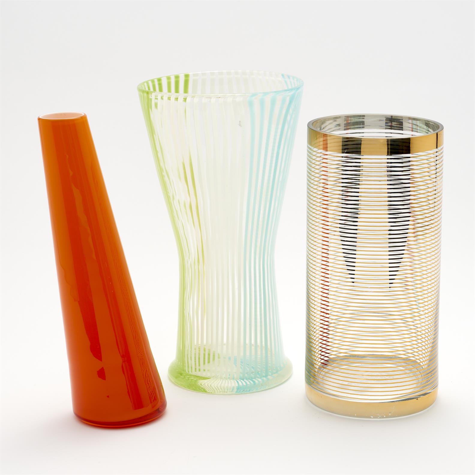 A GROUP OF THREE MID-CENTURY GLASS VASES INCLUDING STRIPED AND CASED ORANGE H.28CM, LEONARD JOEL DELIVERY SIZE: LARGE