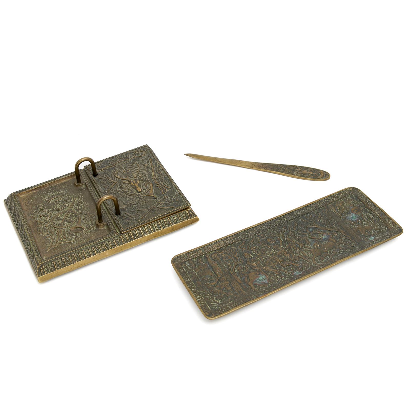 A FRENCH BRONZE DESK SET INCLUDING NOTEPAD HOLDER LETTER OPENER AND PEN TRAY SIGNED M LE VERRIER W.23CM, LEONARD JOEL DELIVERY SIZE: MEDIUM