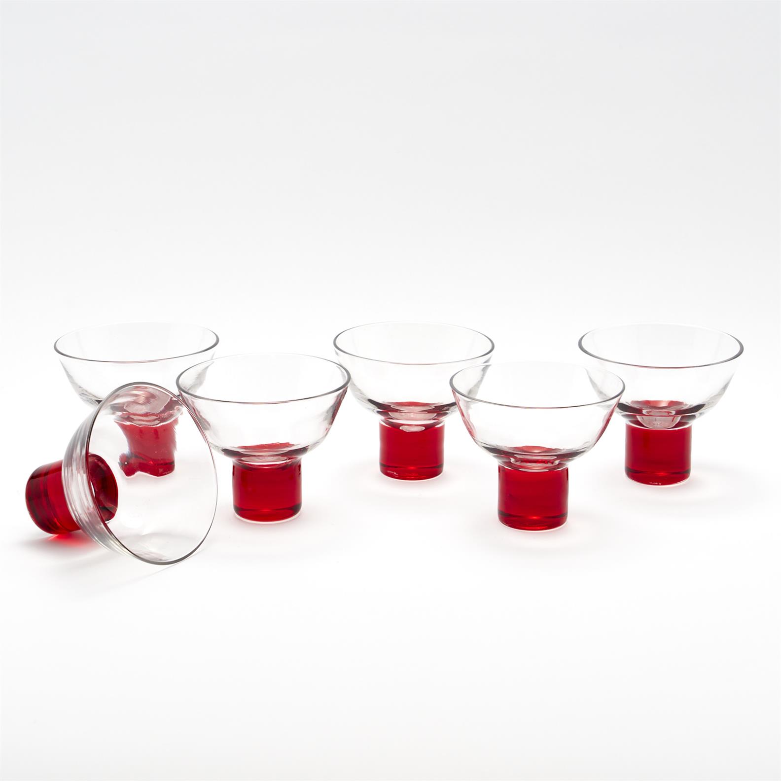 A SET OF SIX RED BASED CHAMPAGNE COUPES DIAMETER.10CM, LEONARD JOEL DELIVERY SIZE: MEDIUM