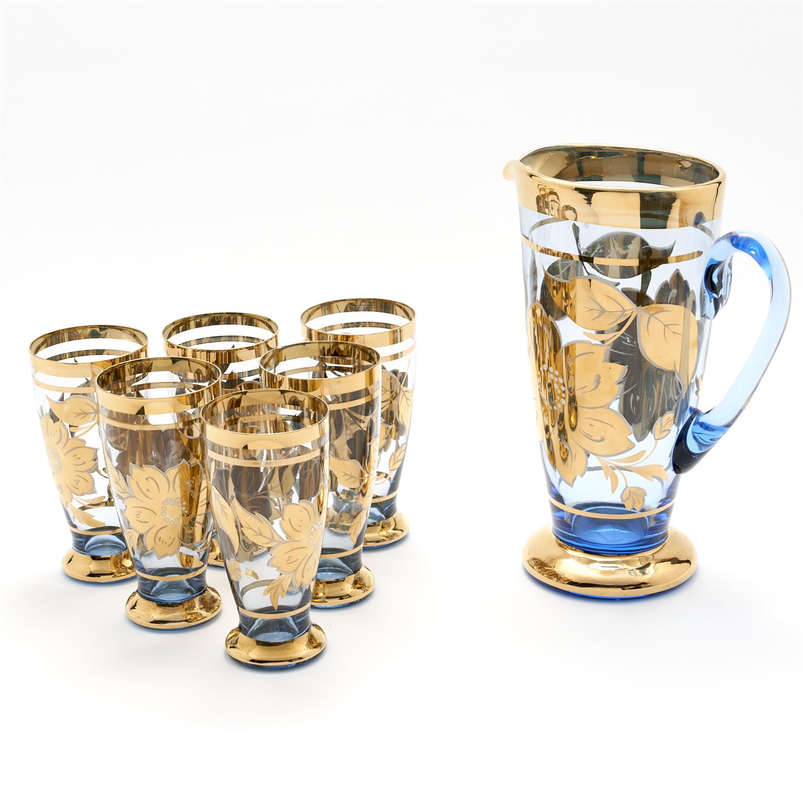 A RETRO SEVEN PIECE GOLD OVERLAY ON BLUE GLASS LEMONADE SET H.26CM, LEONARD JOEL DELIVERY SIZE: MEDIUM