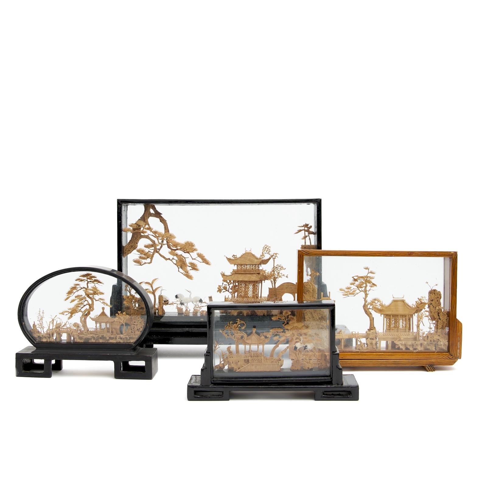 A GROUP OF FOUR VINTAGE CHINESE WOOD FRAMED CORK LANDSCAPES, W.32CM (LONGEST), LEONARD JOEL DELIVERY SIZE: MEDIUM