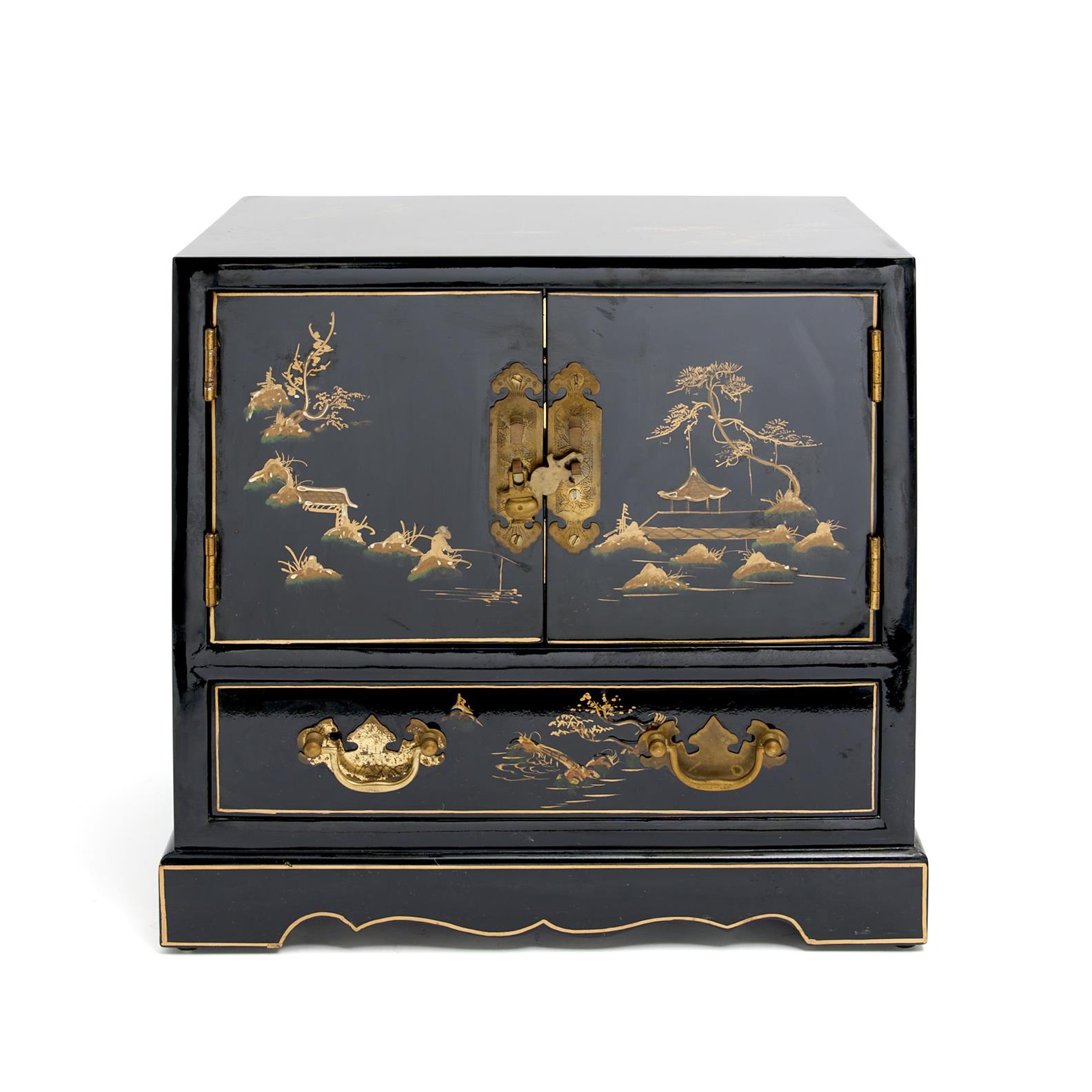 A HEAVILY LACQUERED CHINESE CASKET WITH THREE INTERNAL DRAWERS AND LOWER DRAWER H.38.5CM, LEONARD JOEL DELIVERY SIZE: LARGE