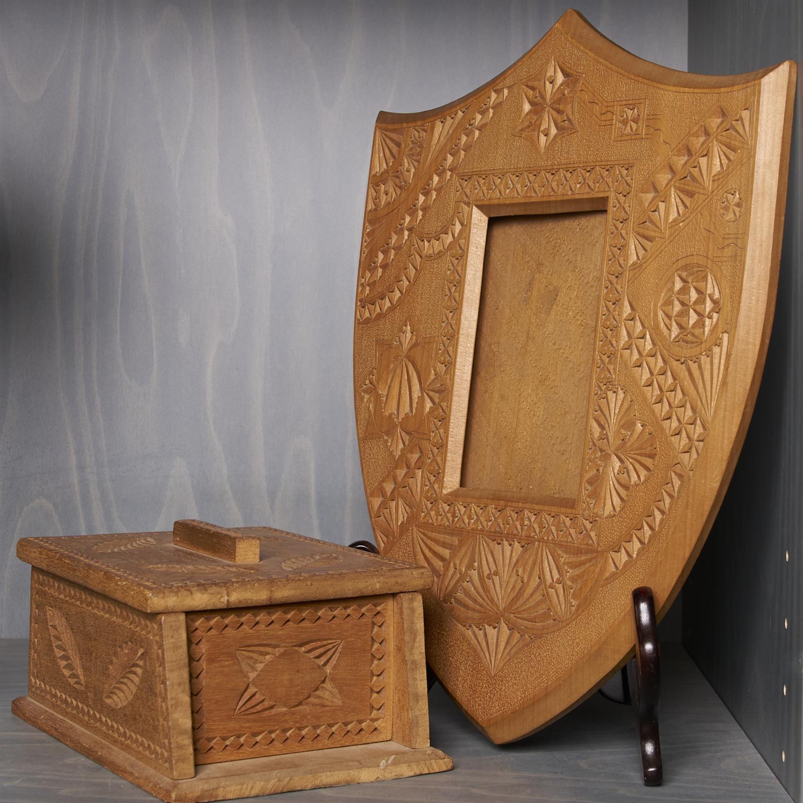 AN AUSTRALIAN CHIP CARVED FOLK ART SHIELD FORM FRAME AND CASKET BOX H.37CM, LEONARD JOEL DELIVERY SIZE: MEDIUM