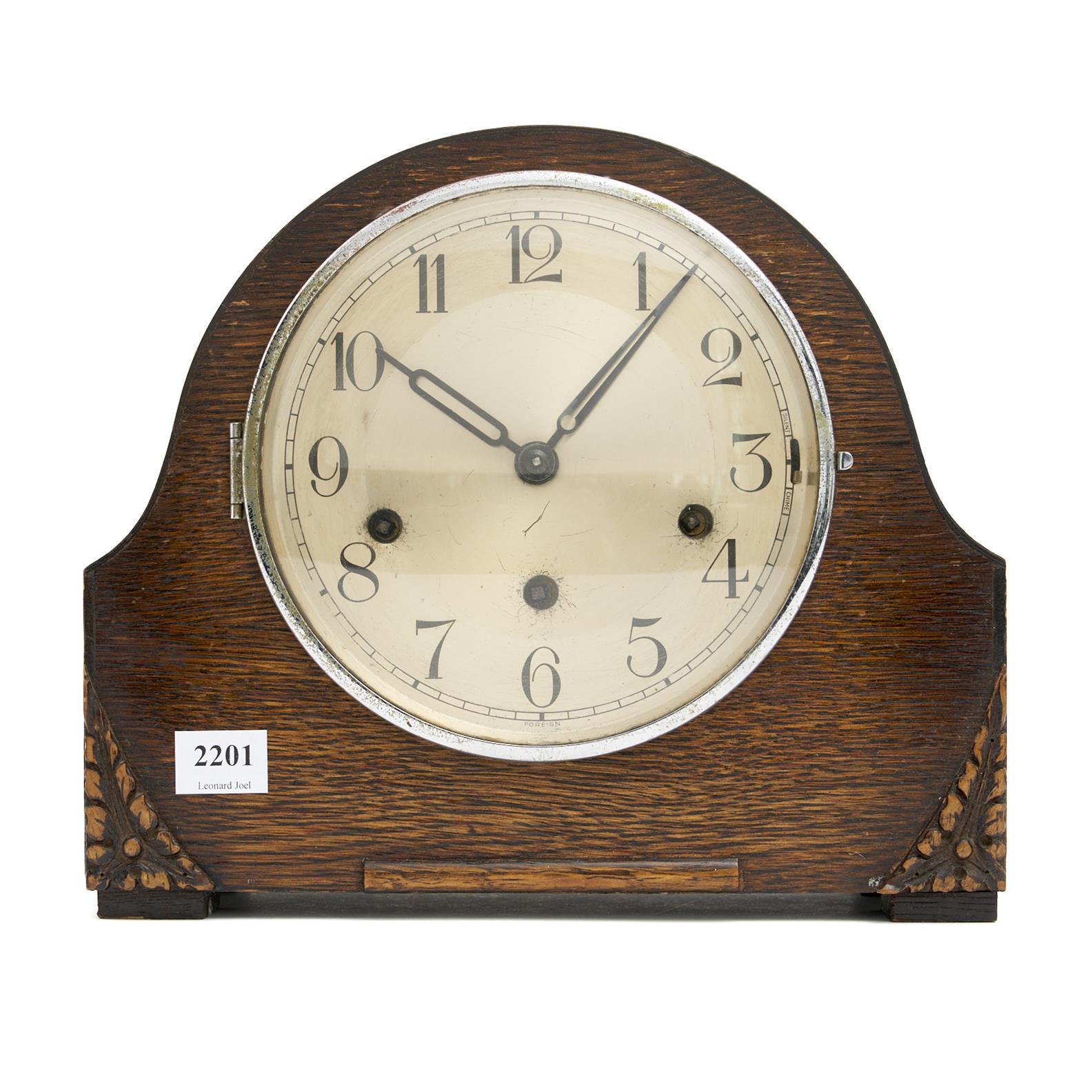 AN ART DECO STYLE ENGLISH OAK MANTLE CLOCK WITH CIRCULAR CHROME DIAL, MOVEMENT BY HALLER, WITH KEY AND PENDULUM (A/F) W.25CM, LEONARD JOEL DELIVERY SIZE: MEDIUM