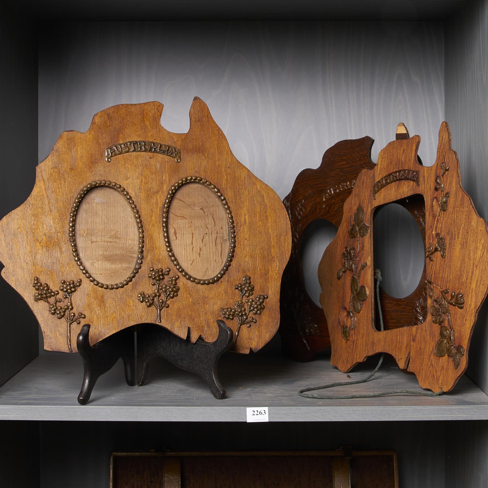 A GROUP OF THREE EARLY 20TH CENTURY FLORAL ADORNED PICTURE FRAMES IN THE SHAPE OF AUSTRALIA (A/F), W.38CM, LEONARD JOEL DELIVERY SIZE: LARGE