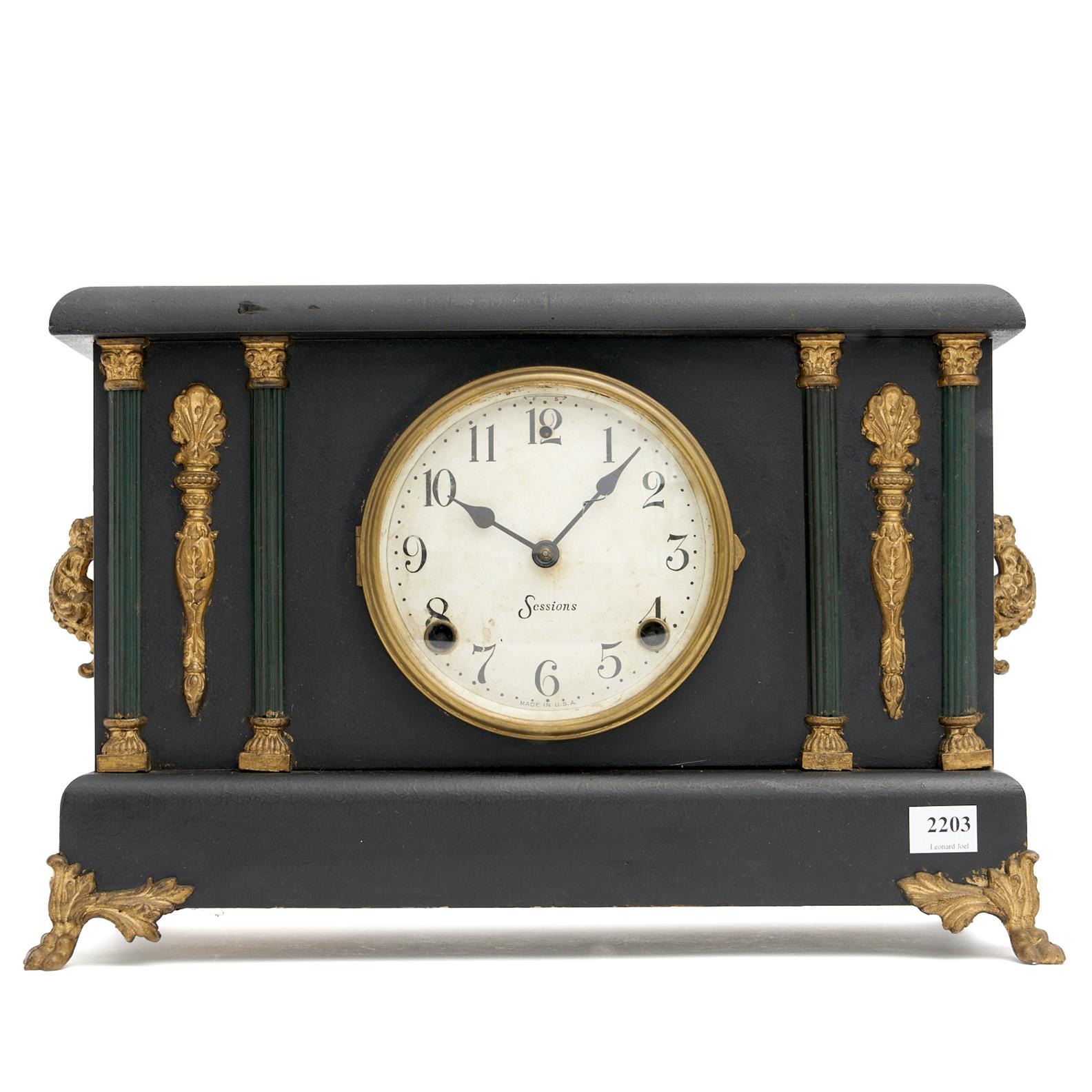 AN AMERICAN SESSIONS WOODEN MANTLE CLOCK WITH KEY AND PENDULUM (A/F) W.37CM, LEONARD JOEL DELIVERY SIZE: LARGE