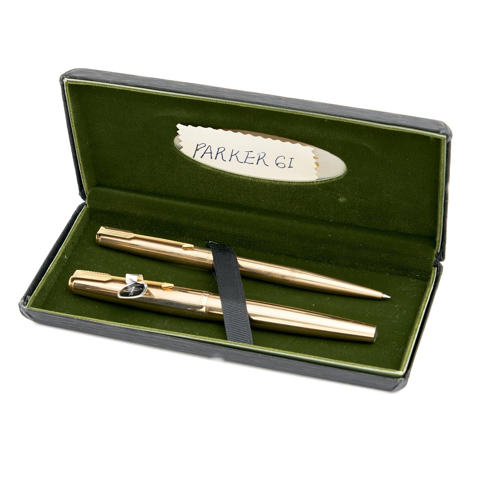 A BOXED PARKER 61 GOLD PLATED FOUNTAIN PEN AND PENCIL WITH 14 CARAT GOLD NIB, LEONARD JOEL DELIVERY SIZE: SMALL