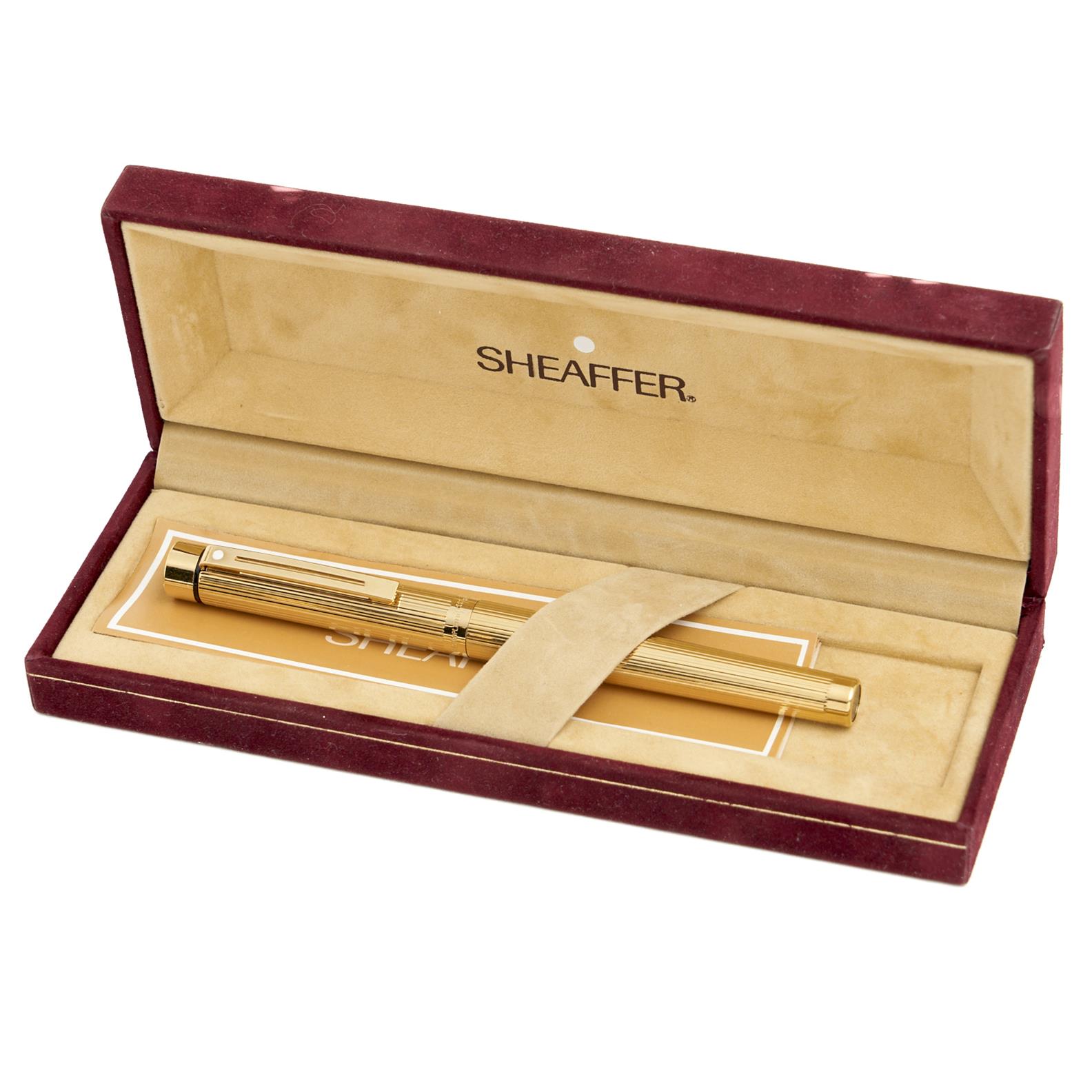 A BOXED SCHAEFFER GOLD PLATED FOUNTAIN PEN WITH 14 KARAT SOLID GOLD NIB, LEONARD JOEL DELIVERY SIZE: SMALL